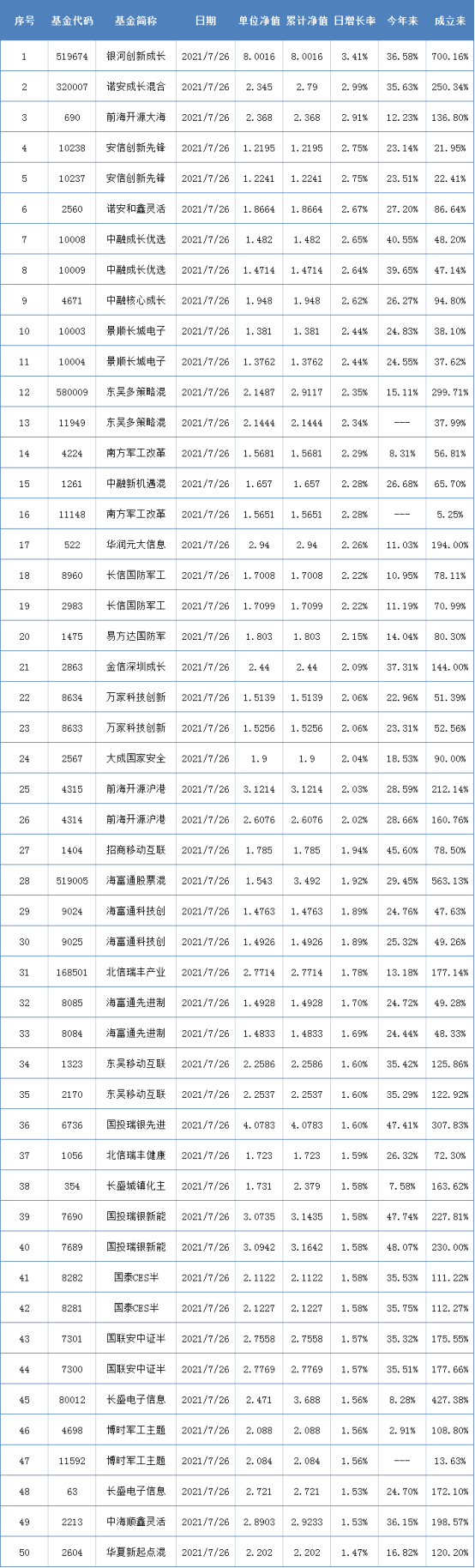 以下为7月26日两市表现最好的50只基金: