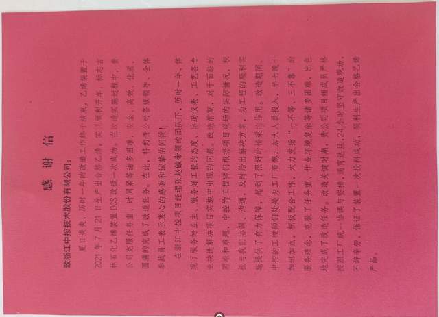 8月6日,吉林石化公司乙烯厂给中控技术发来感谢信,送来锦旗。对中控技术项目团队在本次改造工作中的专业技术和精湛服务给予肯定,中控技术的工程师们不畏艰难、无私奉献、顽强拼搏,为客户创造价值的精神,赢得了吉化公司及各方的高度称赞。