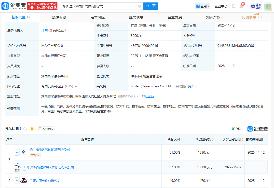 企查查APP显示,近日,福斯达(湖南)气体有限公司成立,法定代表人为江东,注册资本3000万元人民币,经营范围涉及气体、液体分离及纯净设备制造,机械设备租赁,节能管理服务等。企查查股权穿透显示,该公司由福斯达(603173)旗下杭州福斯达气体能源有限公司、常德天盛电化有限公司共同持股。