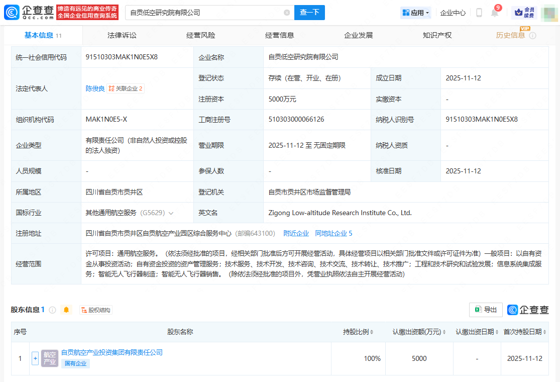 企查查APP显示,近日,自贡低空研究院有限公司成立,法定代表人为陈俊良,注册资本5000万元人民币,经营范围涉及通用航空服务、以自有资金从事投资活动、自有资金投资的资产管理服务等。企查查股权穿透显示,该公司由自贡航空产业投资集团有限责任公司全资持股。