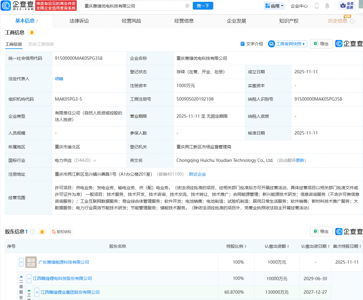 企查查APP显示,近日,重庆惠储优电科技有限公司成立,法定代表人为胡峰,注册资本为1000万元,经营范围包含:供电业务;发电业务、输电业务、供(配)电业务;商业综合体管理服务;电池销售;电池制造等。企查查股权穿透显示,该公司由赣锋锂业(002460)旗下广东惠储能源科技有限公司全资持股。