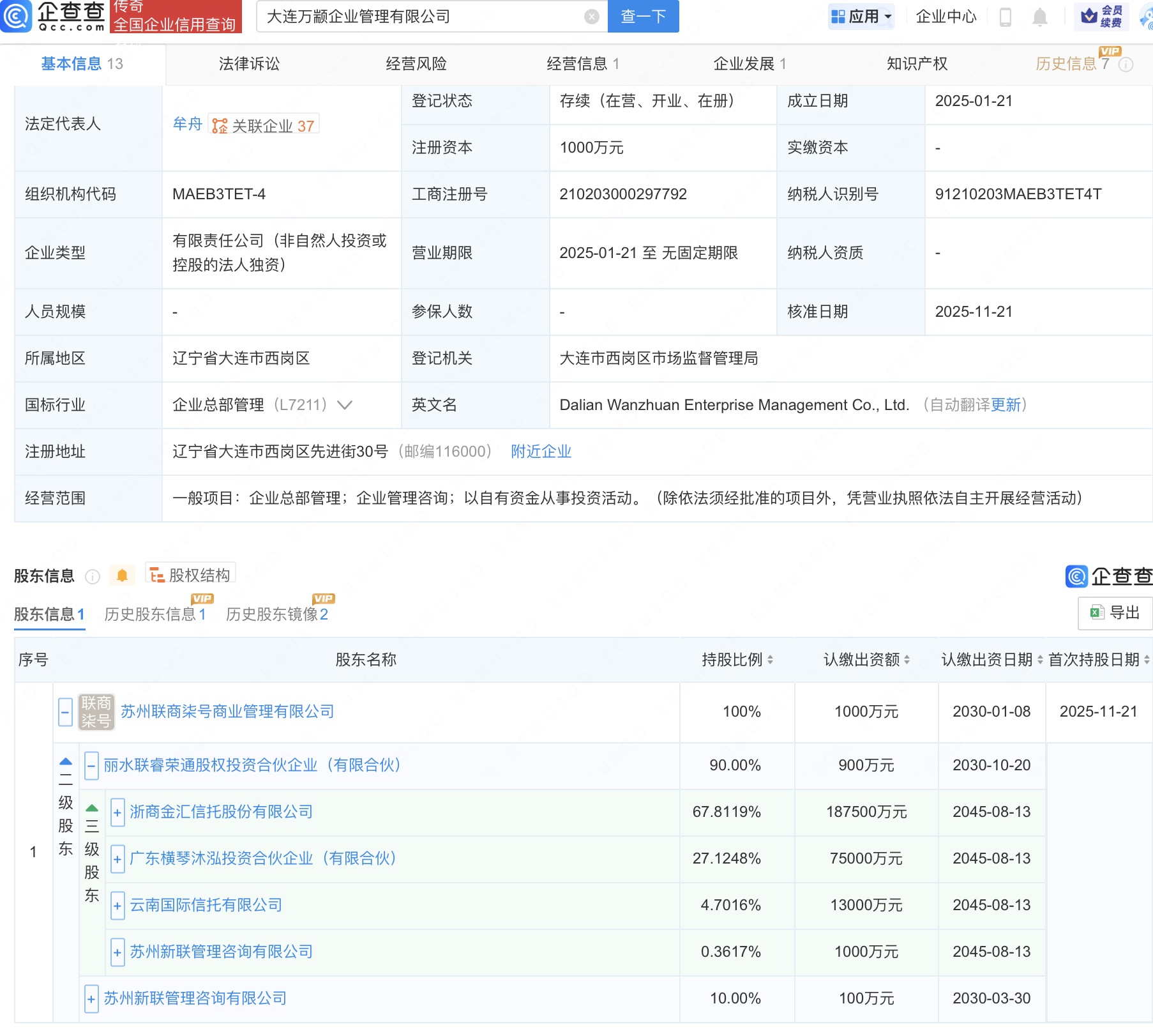 企查查信息显示,大连万颛企业管理有限公司、大连统南企业管理有限责任公司分别成立于今年1月、今年3月,法定代表人均为牟舟,注册资本均为1000万人民币,经营范围为企业总部管理、企业管理咨询、以自有资金从事投资活动。