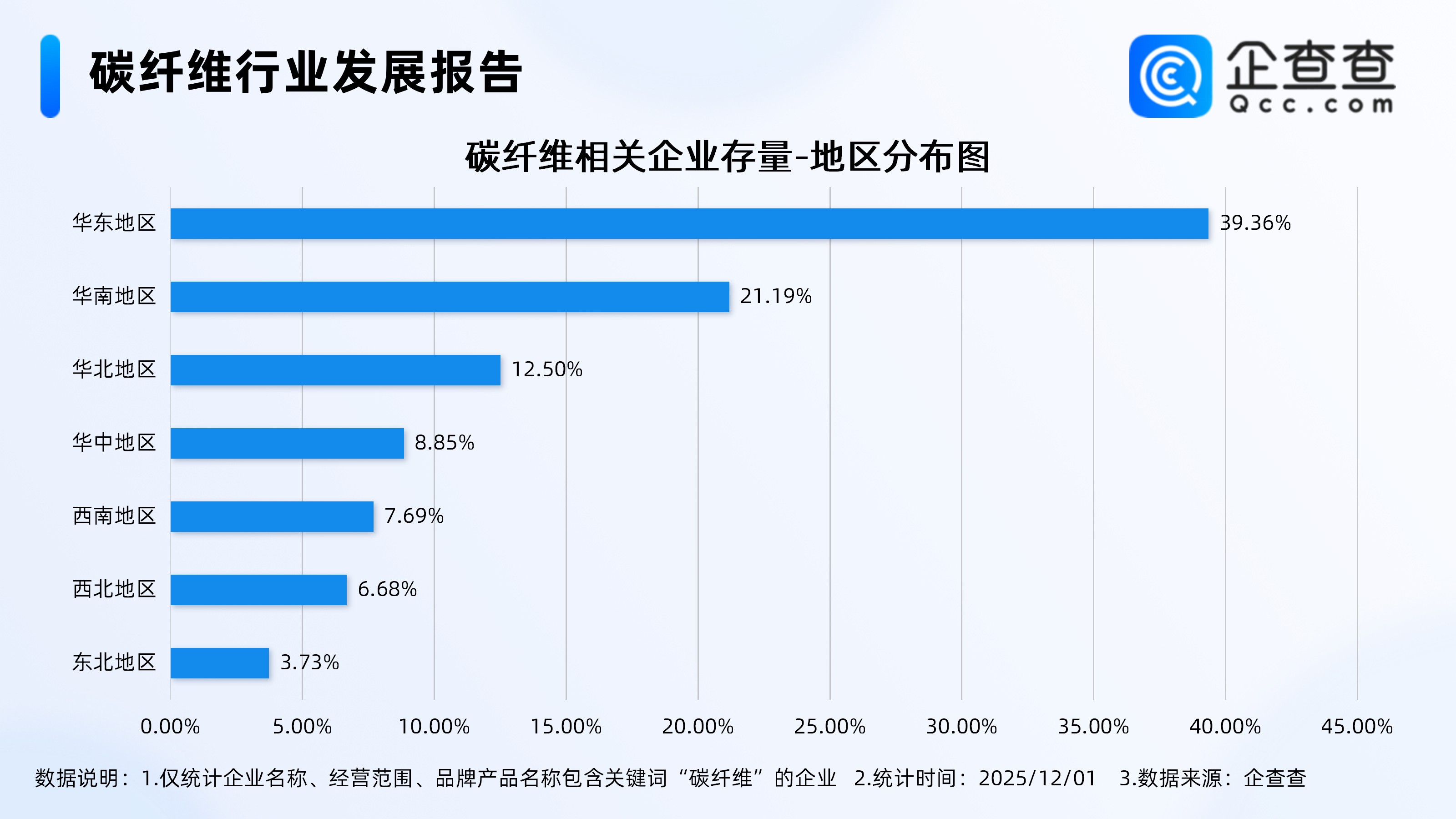 企查查数据显示,截至12月1日,国内现存碳纤维相关企业4.7万家。从经营时间来看,成立年限在1-3年的碳纤维相关企业最多, 占比31.34%。从注册资本来看,碳纤维相关企业多为轻量级企业,注册资本在100万元以内的相关企业最多,占比32.33%。从地区分布来看,分布在华东地区的碳纤维相关企业最多,占比39.36%。注册量方面,2024年全年注册9068家。截至目前,今年已注册7623家。