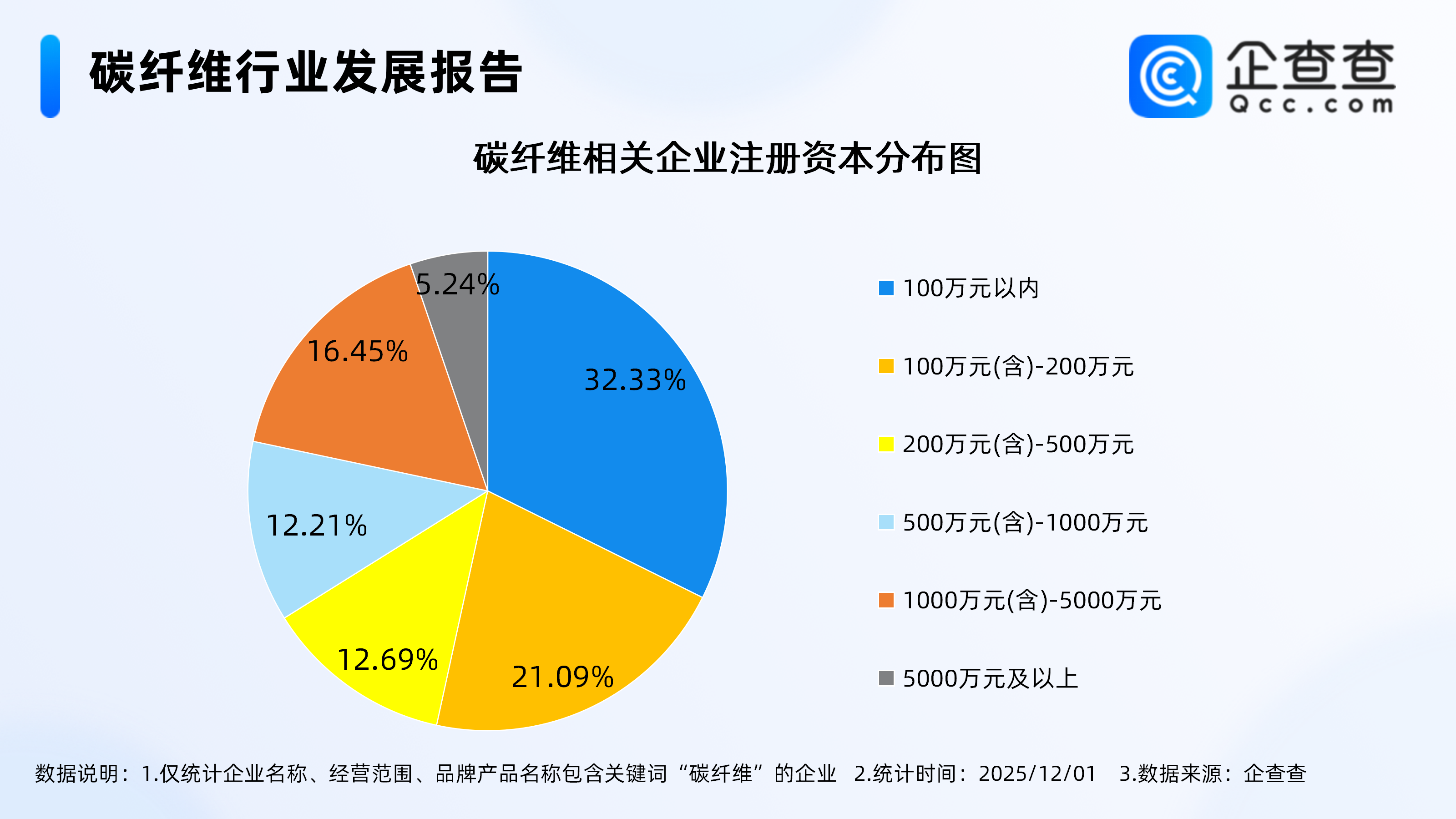 企查查数据显示,从注册资本来看,碳纤维相关企业多为轻量级企业,注册资本在200万元以内的相关企业过半,其中注册资本在100万元以内的相关企业最多,占比32.33%;100万元(含)-200万元的相关企业占比21.09%。