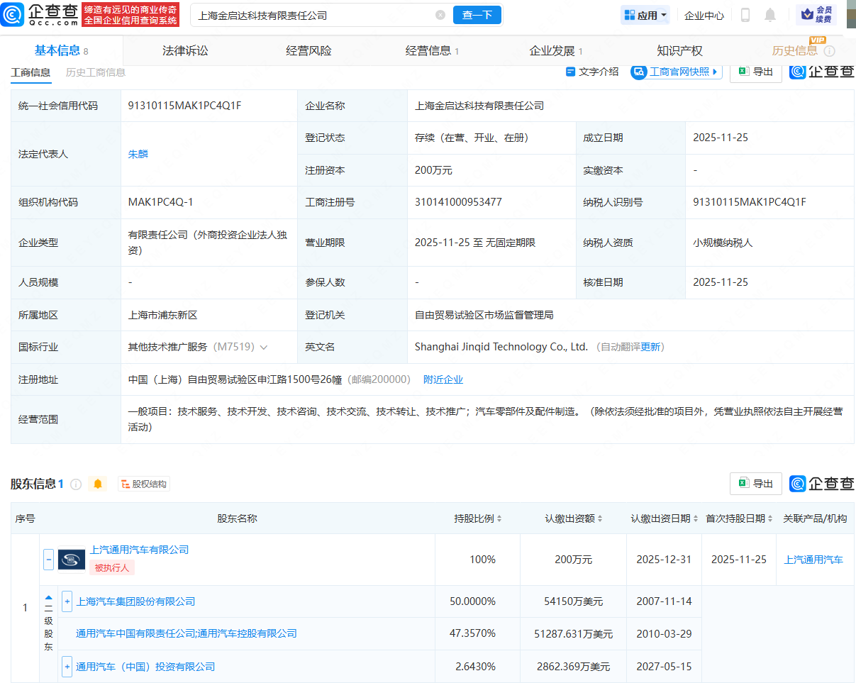 企查查APP显示,近日,上海金启达科技有限责任公司成立,法定代表人为朱麟,经营范围包含:技术服务、技术开发、技术咨询、技术交流、技术转让、技术推广;汽车零部件及配件制造。企查查股权穿透显示,该公司由上汽集团(600104)旗下上汽通用汽车有限公司全资持股。