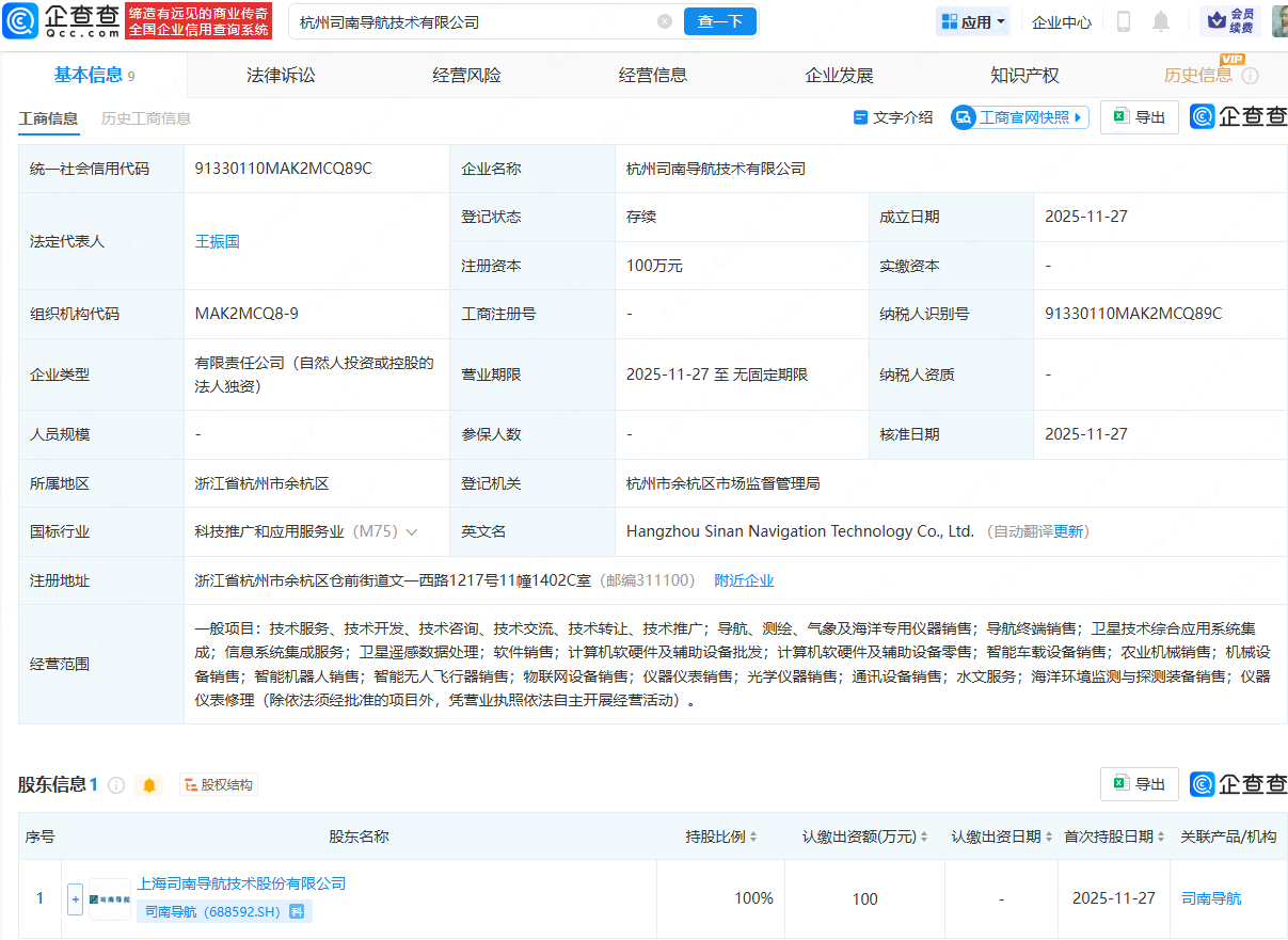 企查查APP显示,近日,杭州司南导航技术有限公司成立,法定代表人为王振国,经营范围包含:导航终端销售;卫星技术综合应用系统集成;卫星遥感数据处理;智能机器人销售;智能无人飞行器销售等。企查查股权穿透显示,该公司由司南导航(688592)全资持股。