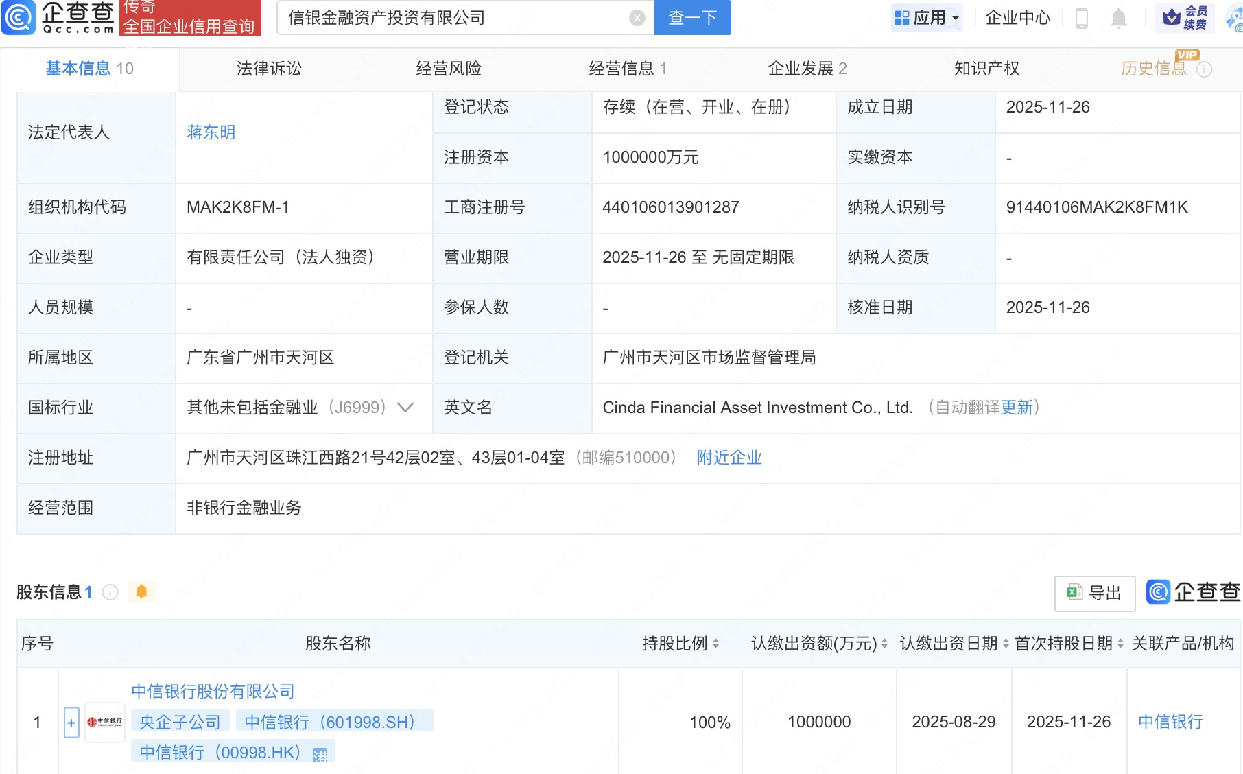 企查查APP显示,近日,信银金融资产投资有限公司成立,法定代表人为蒋东明,注册资本100亿人民币,经营范围为非银行金融业务。企查查股权穿透显示,该公司由中信银行(601998)全资持股。