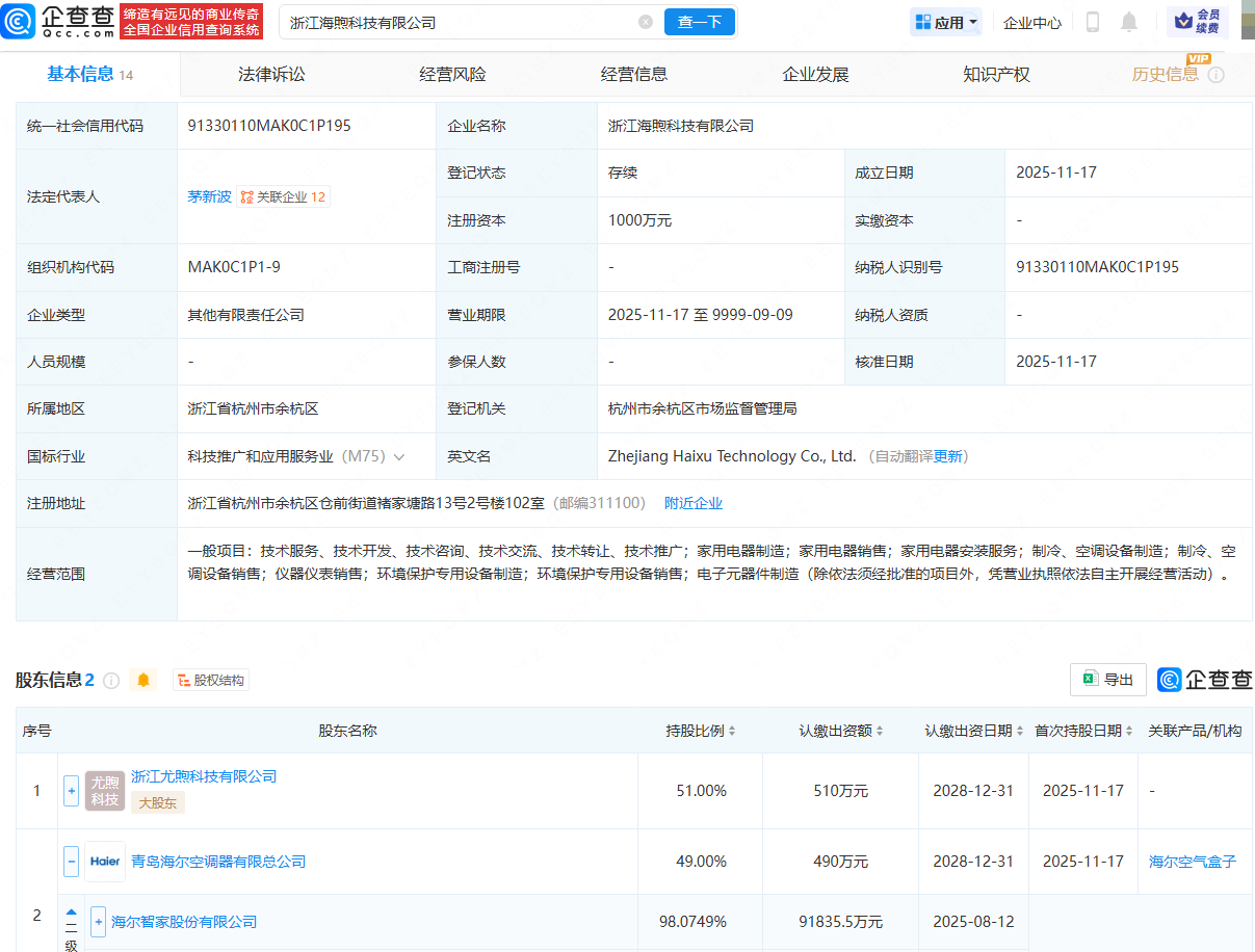 企查查APP显示,近日,浙江海煦科技有限公司成立,法定代表人为茅新波,注册资本为1000万元,经营范围包含:家用电器制造;家用电器销售;家用电器安装服务;环境保护专用设备制造等。企查查股权穿透显示,该公司由浙江尤煦科技有限公司、海尔智家(600690)控股子公司青岛海尔空调器有限总公司共同持股。