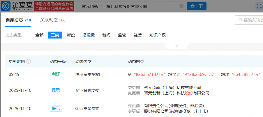 企查查显示,此前,智元机器人完成股改,企业名称变更为智元创新(上海)科技股份有限公司,同时企业类型由有限责任公司(外商投资、非独资)变更为股份有限公司(港澳台投资、未上市)。