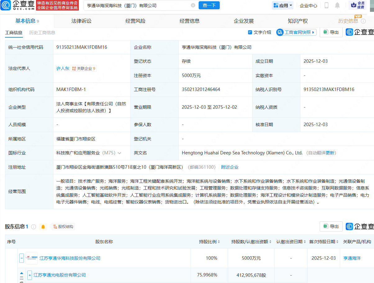 企查查APP显示,近日,亨通华海深海科技(厦门)有限公司成立,法定代表人为许人东,注册资本为5000万元,经营范围包含:海洋服务;海洋工程关键配套系统开发;海洋能系统与设备销售;光通信设备制造;光缆销售等。企查查股权穿透显示,该公司由亨通光电(600487)旗下江苏亨通华海科技股份有限公司全资持股。