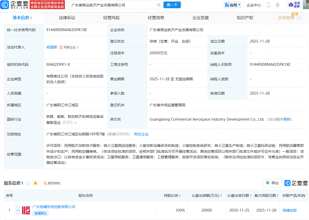 企查查APP显示,近日,广东省商业航天产业发展有限公司成立,法定代表人为杨晨晖,注册资本为2亿元,经营范围包含:民用航天发射技术服务;微小卫星测运控服务;火箭发射设备研发和制造;火箭控制系统研发等。企查查股权穿透显示,该公司由广东恒健投资控股有限公司全资持股。