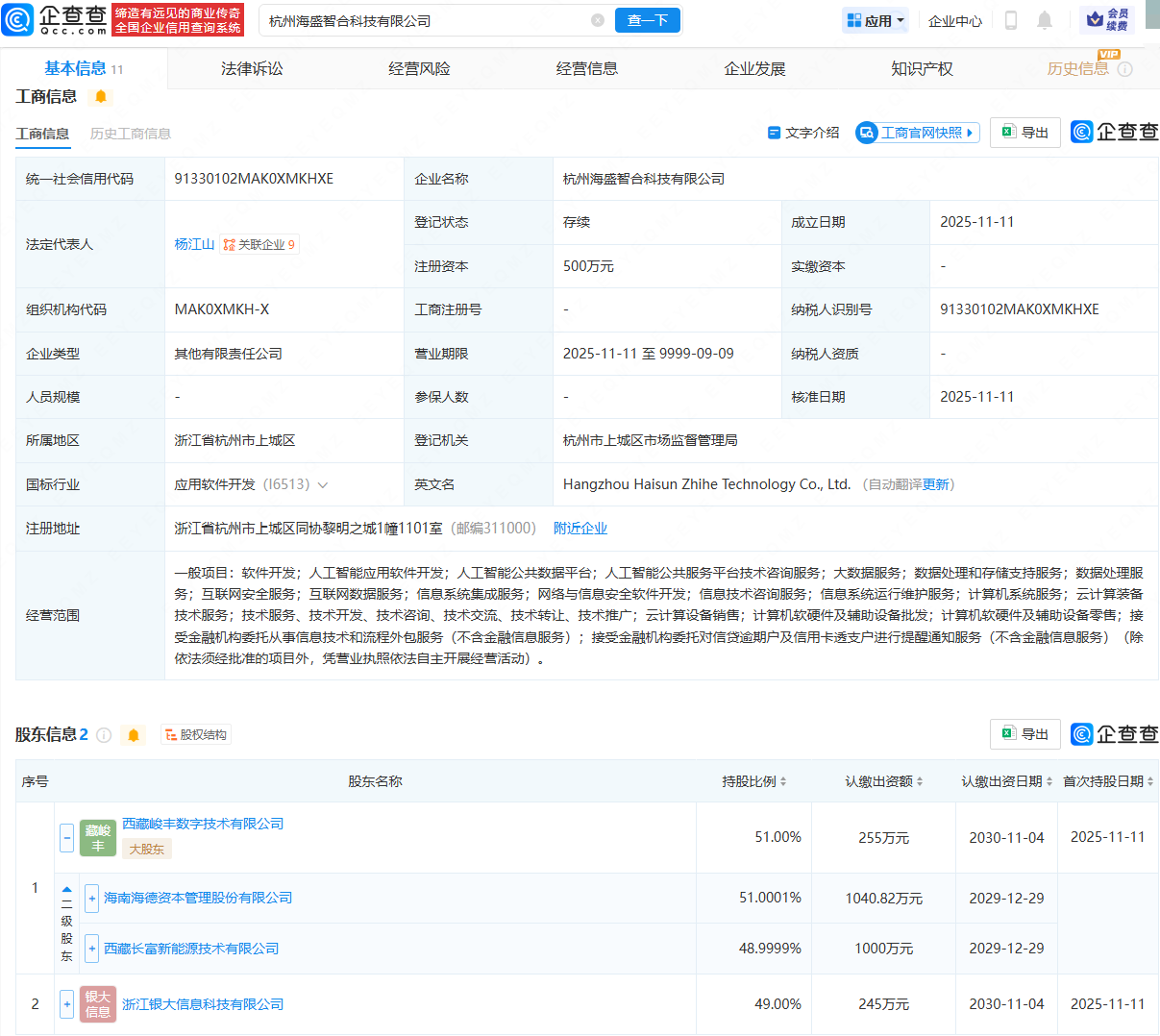 企查查APP显示,近日,杭州海盛智合科技有限公司成立,法定代表人为杨江山,经营范围包含:人工智能应用软件开发;人工智能公共数据平台;大数据服务;数据处理和存储支持服务;数据处理服务等。企查查股权穿透显示,该公司由海德股份(000567)旗下西藏峻丰数字技术有限公司、浙江银大信息科技有限公司共同持股。