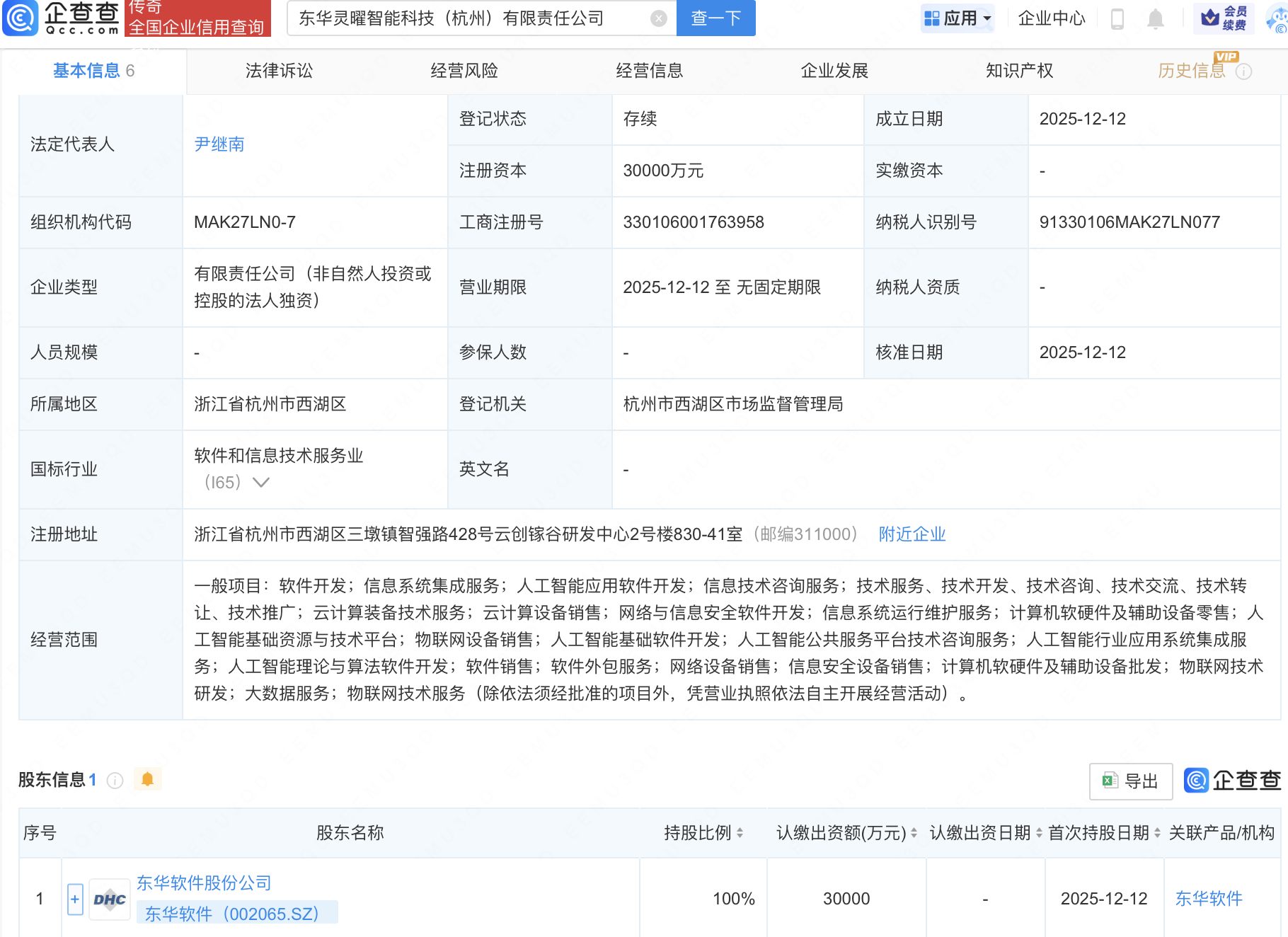 企查查APP显示,近日,东华灵曜智能科技(杭州)有限责任公司成立,注册资本3亿元,经营范围包含:人工智能基础资源与技术平台;物联网设备销售;人工智能基础软件开发;人工智能公共服务平台技术咨询服务等。企查查股权穿透显示,该公司由东华软件(002065)全资持股。