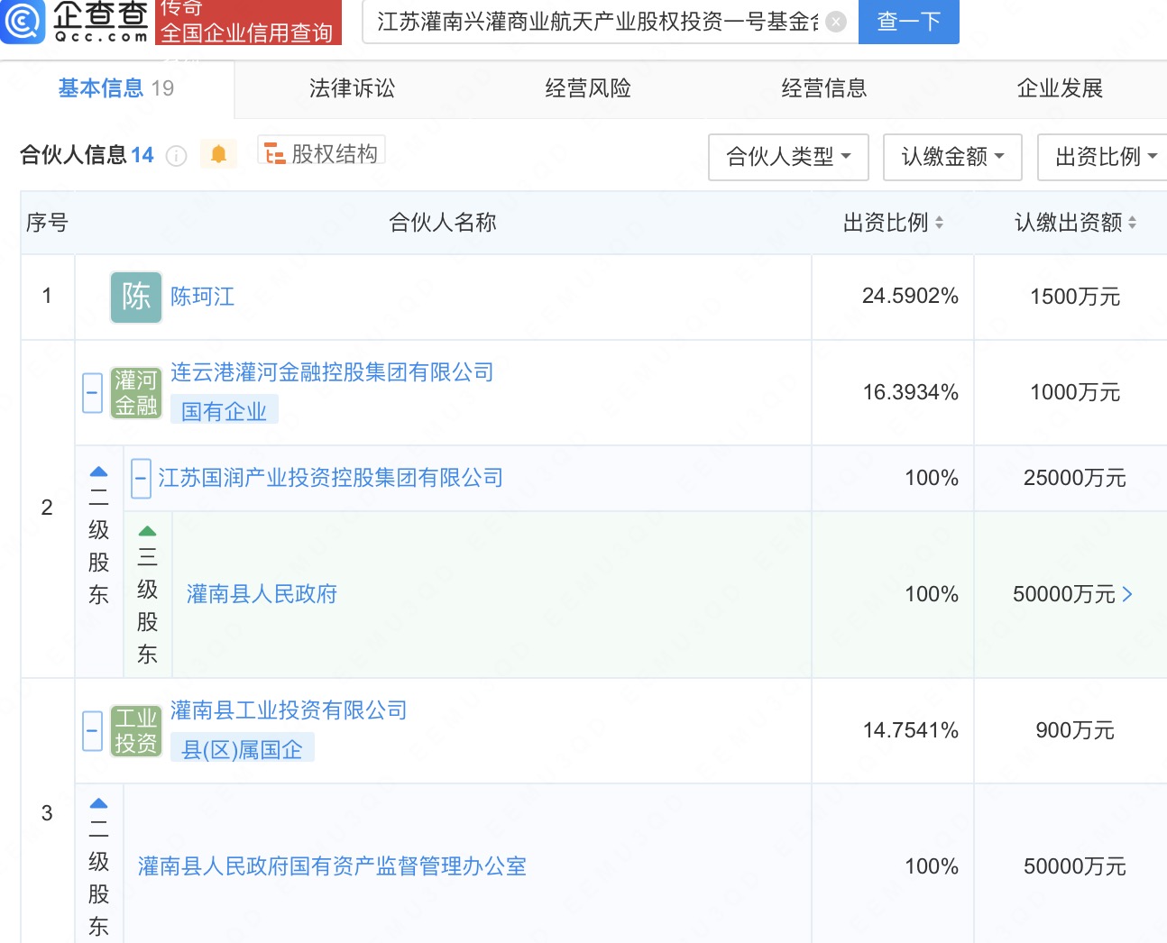 企查查APP显示,近日,江苏灌南兴灌商业航天产业股权投资一号基金合伙企业(有限合伙)成立,经营范围包含:私募股权投资基金管理、创业投资基金管理服务等。企查查股权穿透显示,该企业由连云港灌河金融控股集团有限公司等共同出资。
