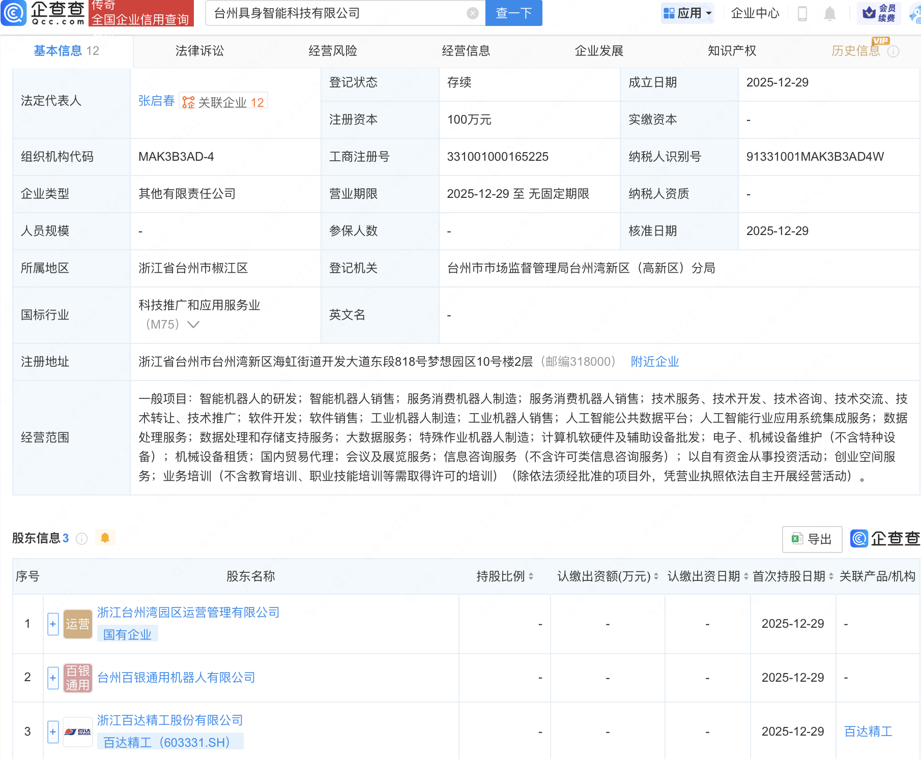 企查查APP显示,近日,台州具身智能科技有限公司成立,经营范围包含:智能机器人的研发;智能机器人销售;服务消费机器人制造;人工智能公共数据平台;人工智能行业应用系统集成服务等。企查查股权穿透显示,该公司由百达精工(603331)等共同持股。