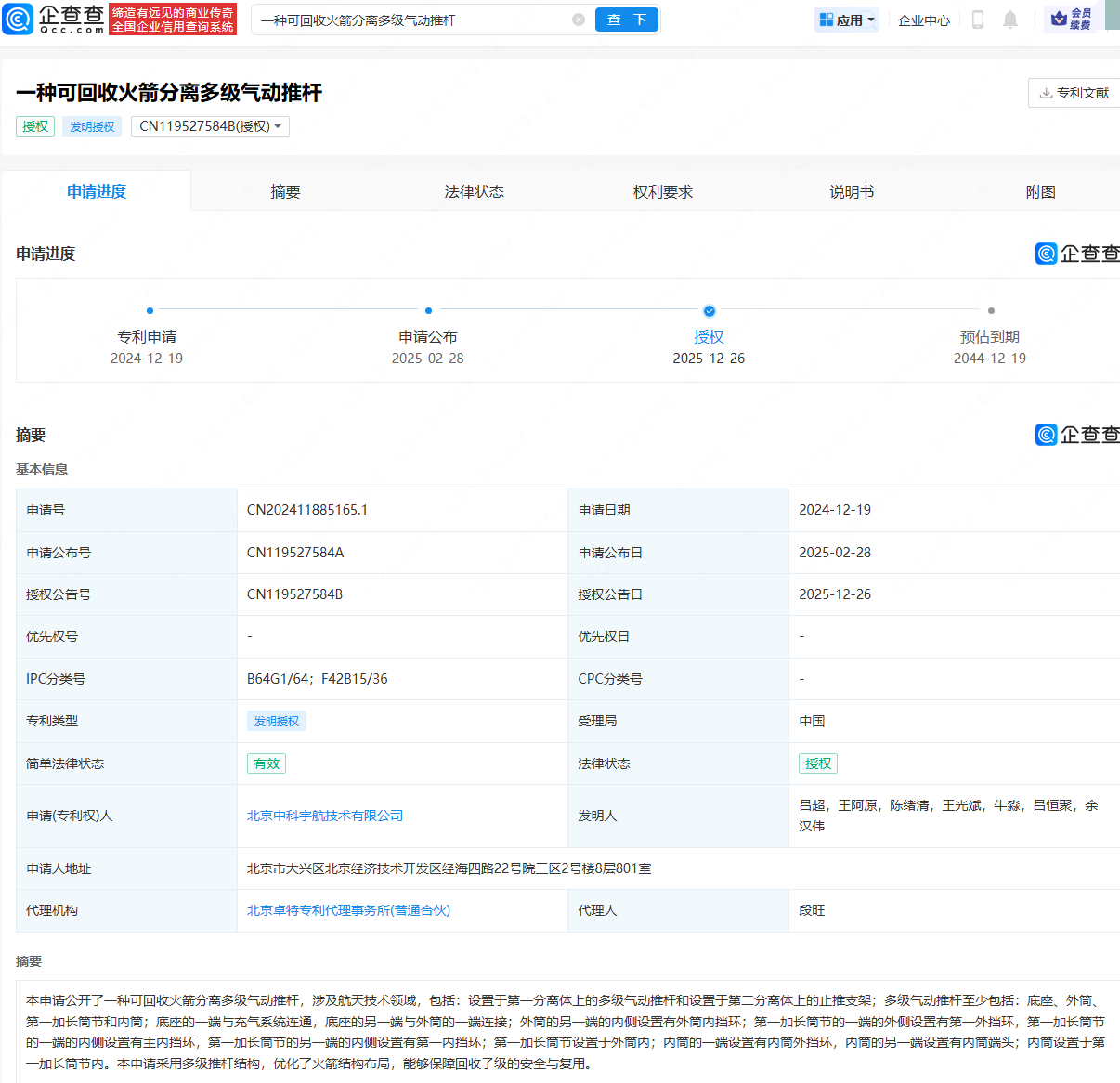 企查查APP显示,近日,北京中科宇航技术有限公司申请的“一种可回收火箭分离多级气动推杆”专利获授权。