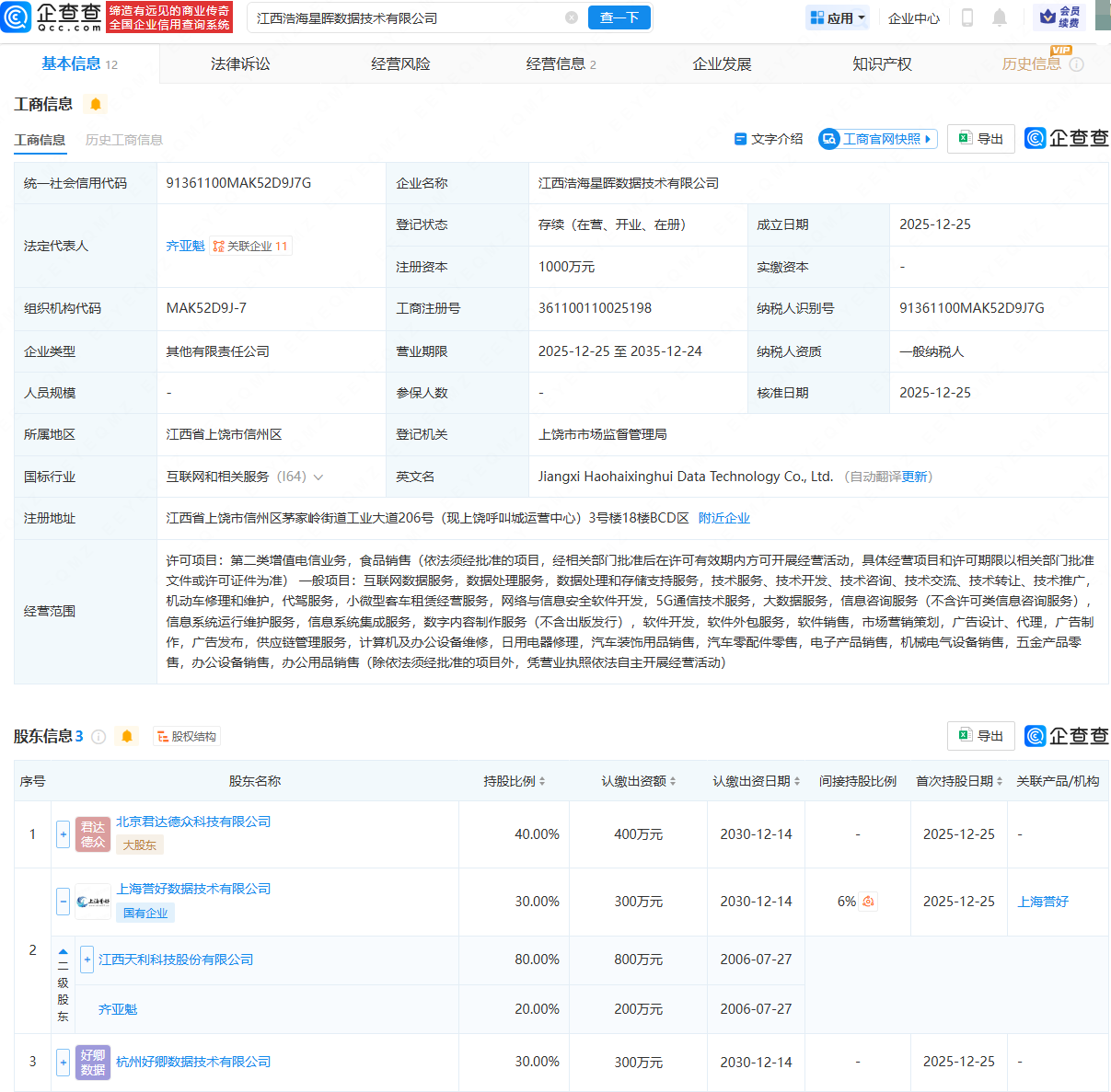 企查查APP显示,近日,江西浩海星晖数据技术有限公司成立,法定代表人为齐亚魁,注册资本为1000万元,经营范围包含:互联网数据服务,数据处理服务,网络与信息安全软件开发,5G通信技术服务,大数据服务等。企查查股权穿透显示,该公司由北京君达德众科技有限公司、天利科技(300399)旗下上海誉好数据技术有限公司等共同持股。