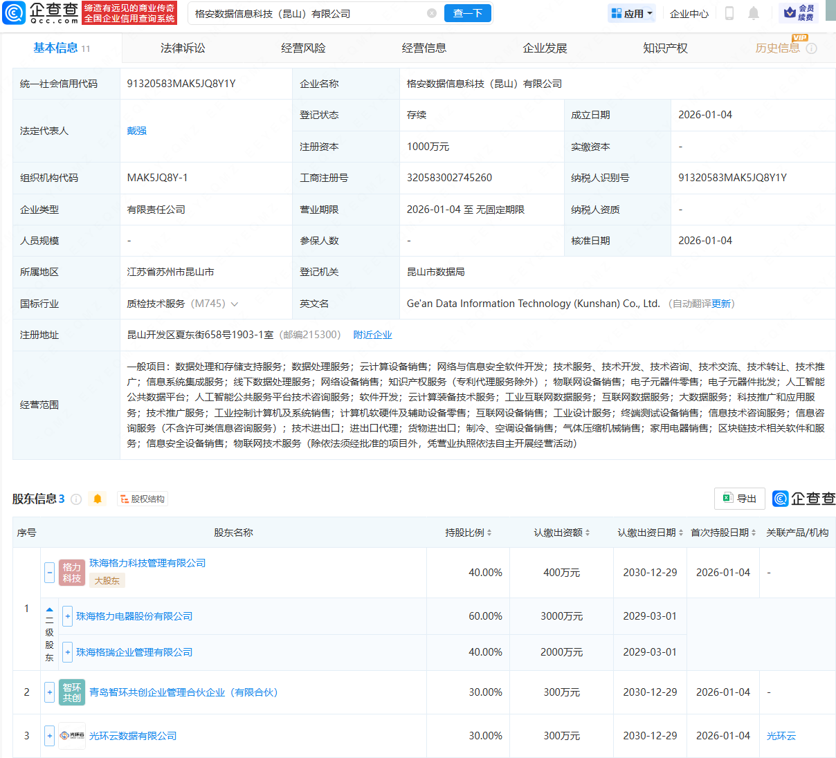 企查查APP显示,近日,格安数据信息科技(昆山)有限公司成立,法定代表人为戴强,注册资本为1000万元,经营范围包含:数据处理和存储支持服务;数据处理服务;云计算设备销售;物联网设备销售;电子元器件零售等。企查查股权穿透显示,该公司由格力电器(000651)旗下珠海格力科技管理有限公司、光环云数据有限公司等共同持股。