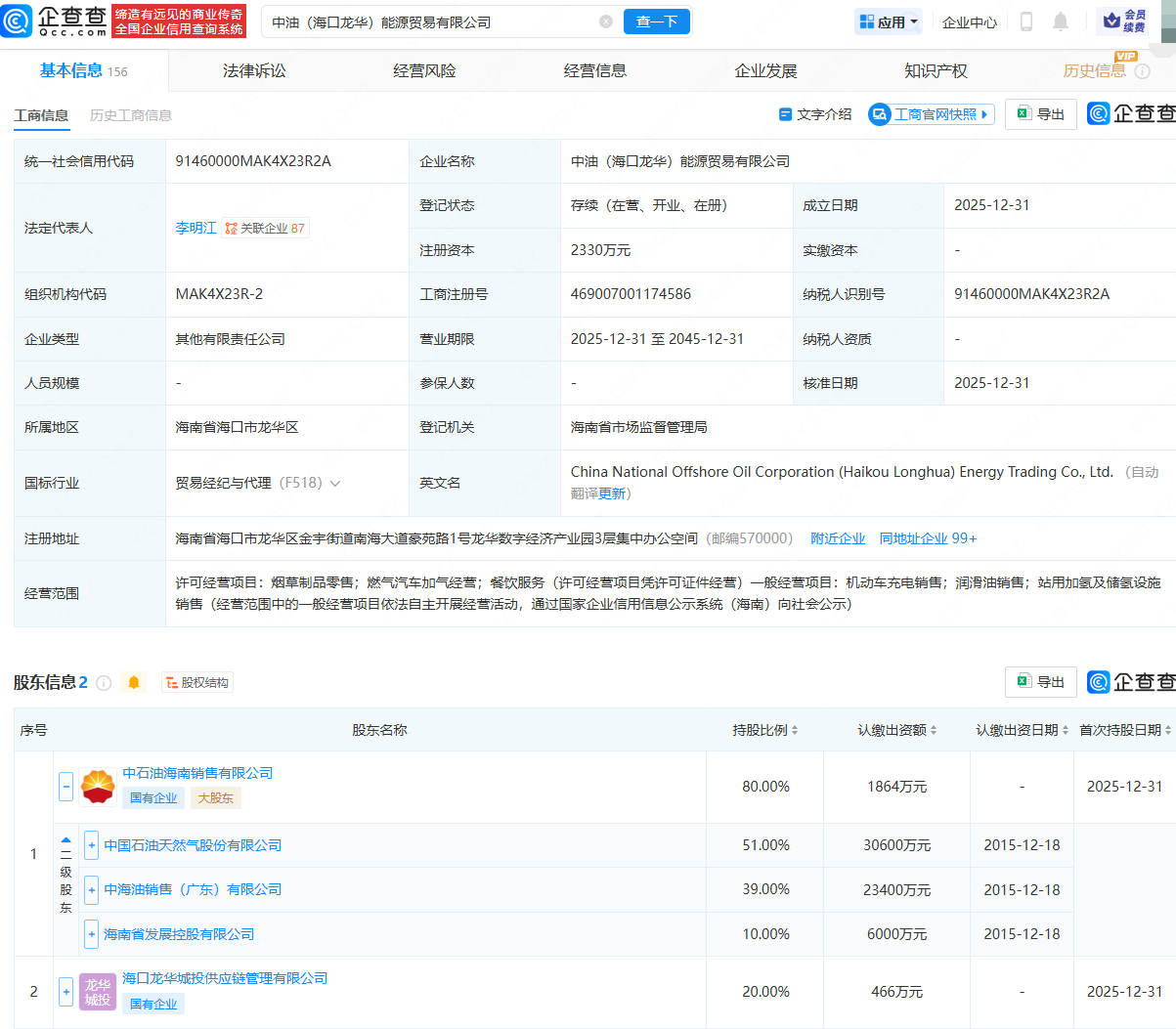 企查查APP显示,近日,中油(海口龙华)能源贸易有限公司成立,法定代表人为李明江,注册资本为2330万元,经营范围包含:烟草制品零售;燃气汽车加气经营;机动车充电销售;润滑油销售;站用加氢及储氢设施销售等。企查查股权穿透显示,该公司由中国石油(601857)旗下中石油海南销售有限公司、海口龙华城投供应链管理有限公司共同持股。