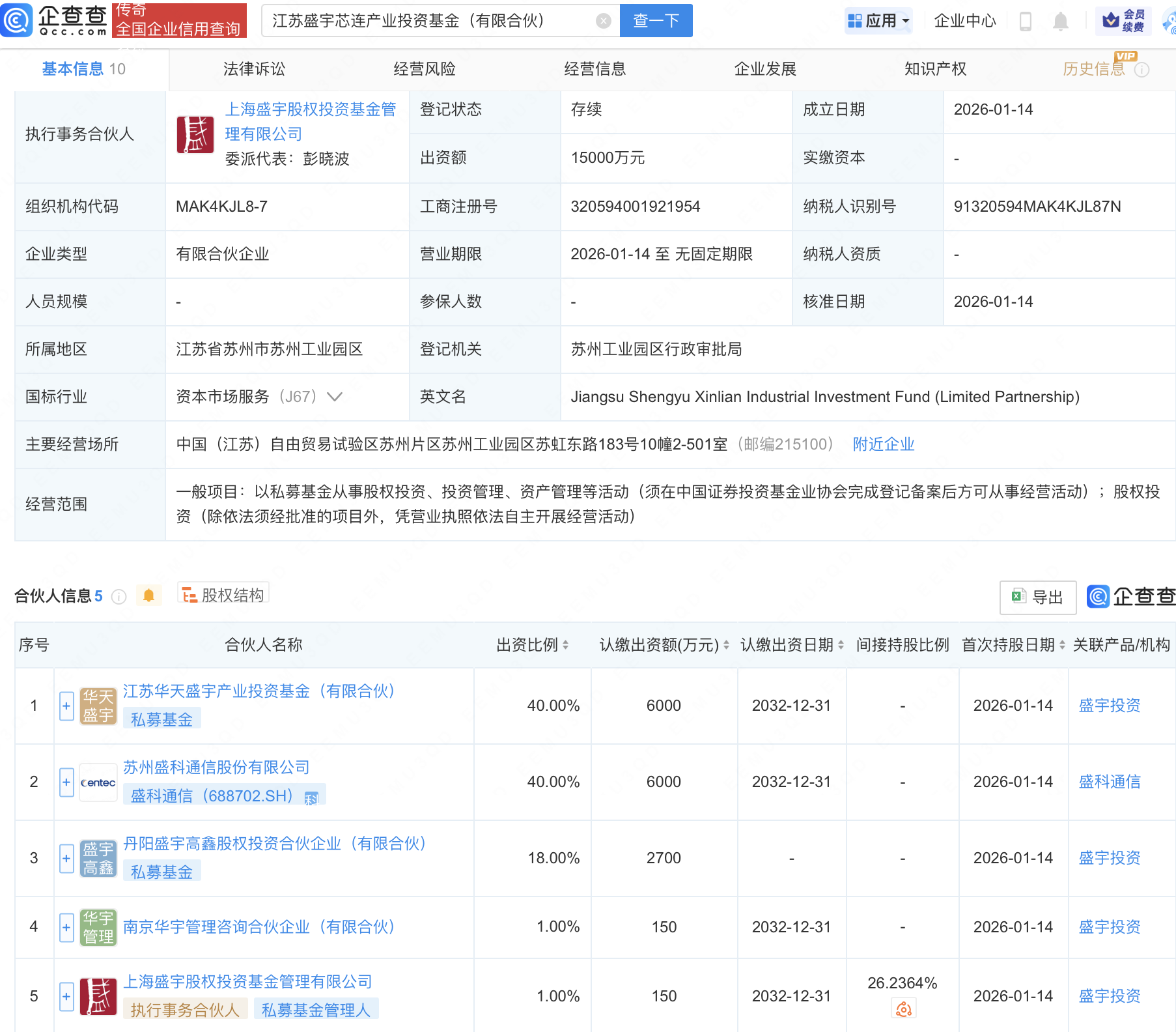 企查查APP显示,近日,江苏盛宇芯连产业投资基金(有限合伙)成立,出资额1.5亿元,经营范围包含:以私募基金从事股权投资、投资管理、资产管理等活动。企查查股权穿透显示,该企业由盛科通信(688702)等共同出资。