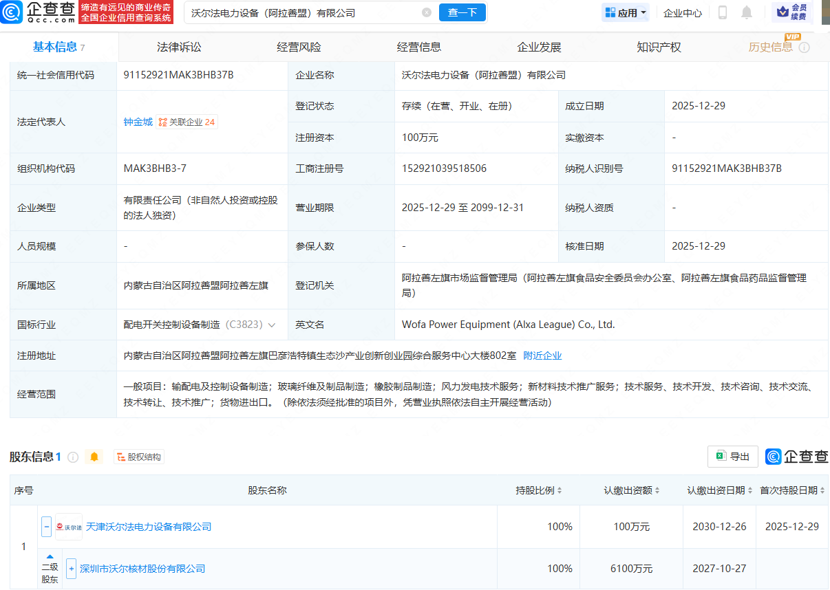 企查查APP显示,近日,沃尔法电力设备(阿拉善盟)有限公司成立,法定代表人为钟金城,经营范围包含:输配电及控制设备制造;玻璃纤维及制品制造;橡胶制品制造;风力发电技术服务;新材料技术推广服务等。企查查股权穿透显示,该公司由沃尔核材(002130)间接全资持股。