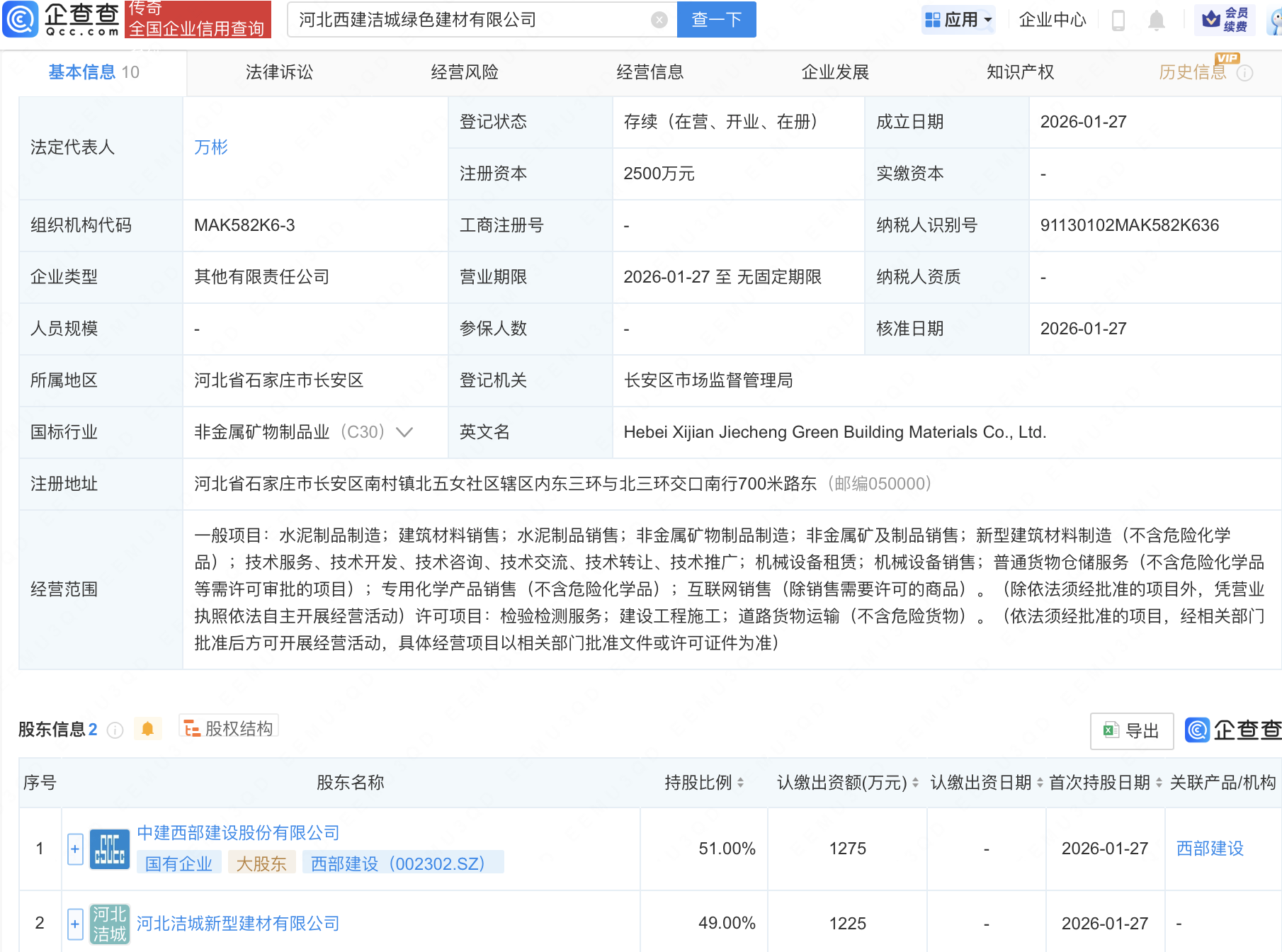 企查查APP显示,近日,河北西建洁城绿色建材有限公司成立,注册资本2500万元,经营范围包含:非金属矿物制品制造;非金属矿及制品销售;新型建筑材料制造(不含危险化学品)等。企查查股权穿透显示,该公司由西部建设(002302)等共同持股。