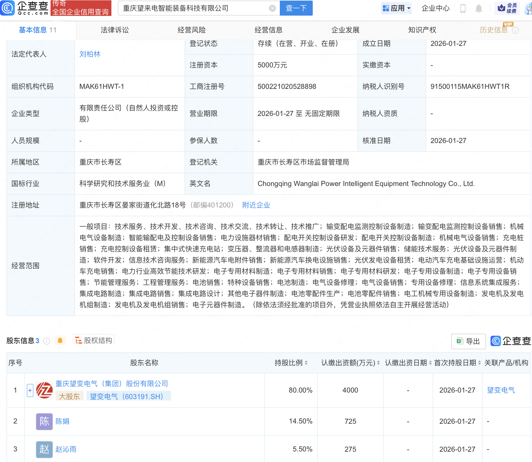 企查查APP显示,近日,重庆望来电智能装备科技有限公司成立,注册资本5000万元,经营范围包含:集成电路制造;集成电路销售;集成电路设计;其他电子器件制造;电池零配件生产等。企查查股权穿透显示,该公司由望变电气(603191)等共同持股。