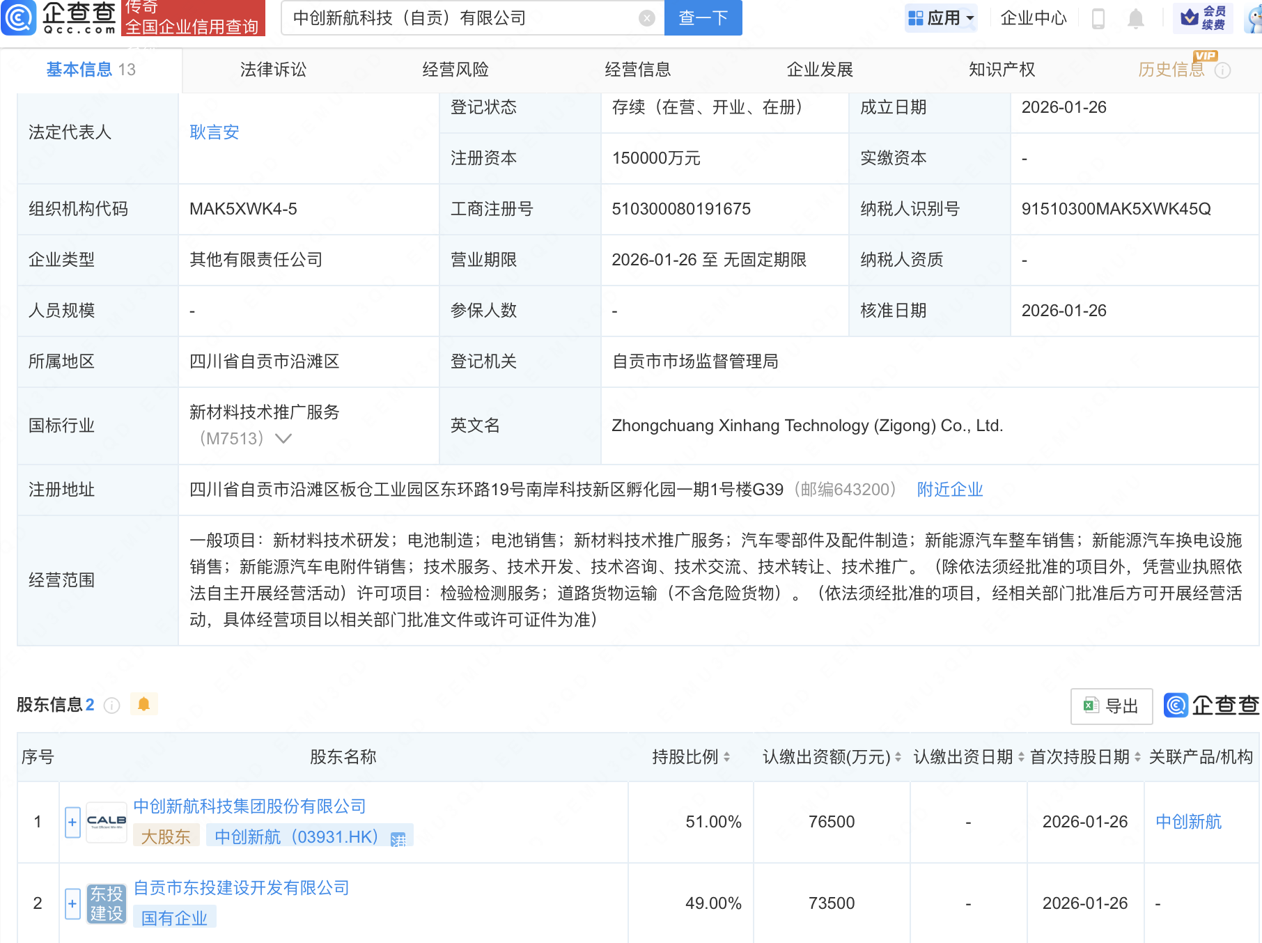 企查查APP显示,近日,中创新航科技(自贡)有限公司成立,注册资本15亿元,经营范围包含:汽车零部件及配件制造;新能源汽车整车销售;新能源汽车换电设施销售;新能源汽车电附件销售等。企查查股权穿透显示,该公司由中创新航(03931.HK)等共同持股。