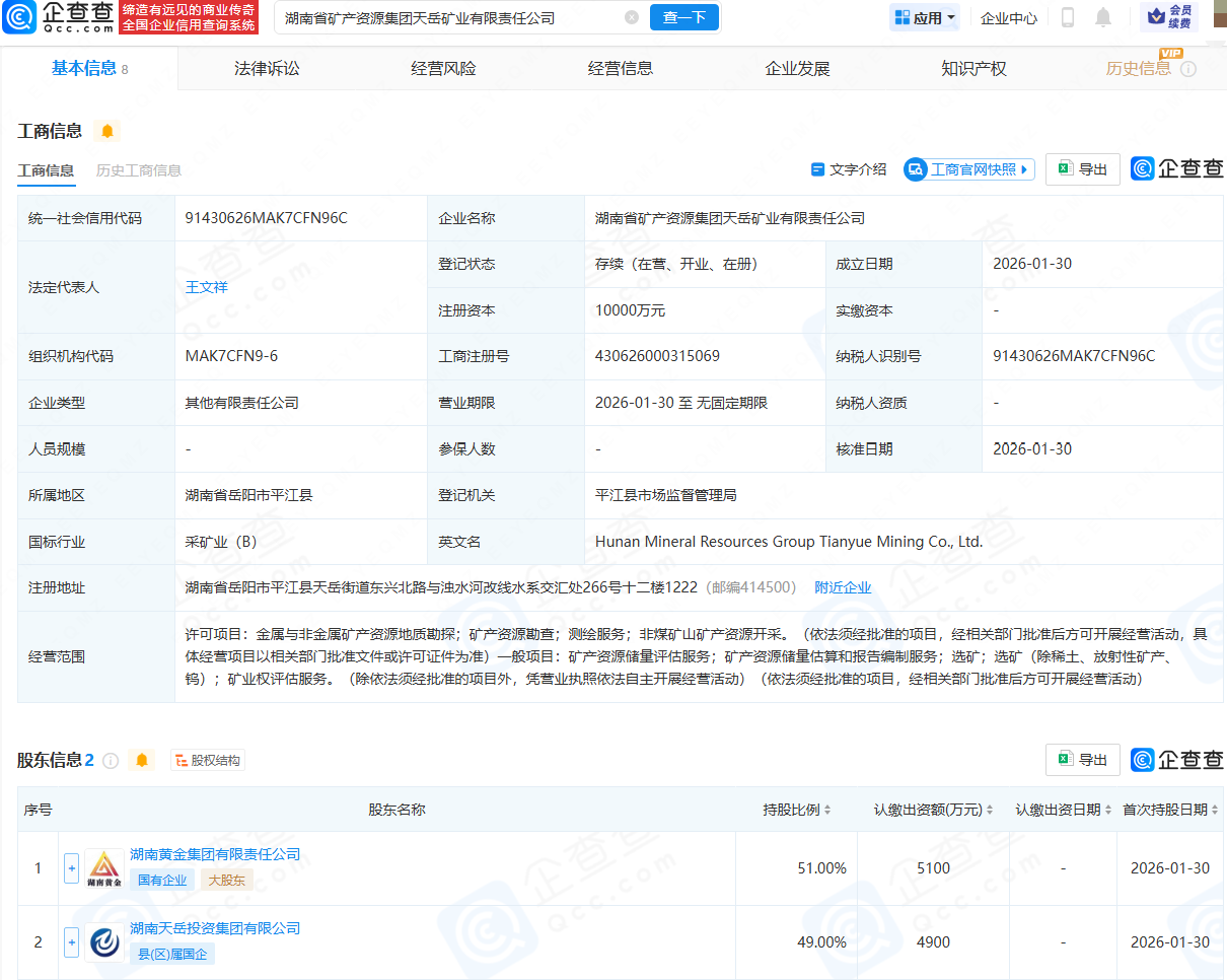 企查查APP显示,近日,湖南省矿产资源集团天岳矿业有限责任公司成立,法定代表人为王文祥,注册资本为1亿元,经营范围包含:金属与非金属矿产资源地质勘探;矿产资源勘查;测绘服务;非煤矿山矿产资源开采等。企查查股权穿透显示,该公司由湖南黄金集团有限责任公司、湖南天岳投资集团有限公司共同持股。