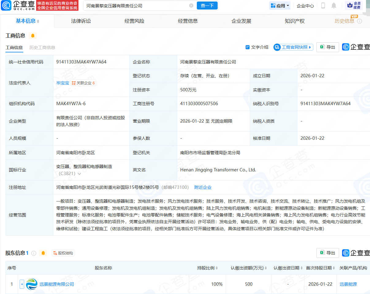 企查查APP显示,近日,河南景擎变压器有限责任公司成立,法定代表人为毕宝宝,经营范围包含:变压器、整流器和电感器制造;发电技术服务;风力发电技术服务;发电机及发电机组制造等。企查查股权穿透显示,该公司由远景能源有限公司全资持股。