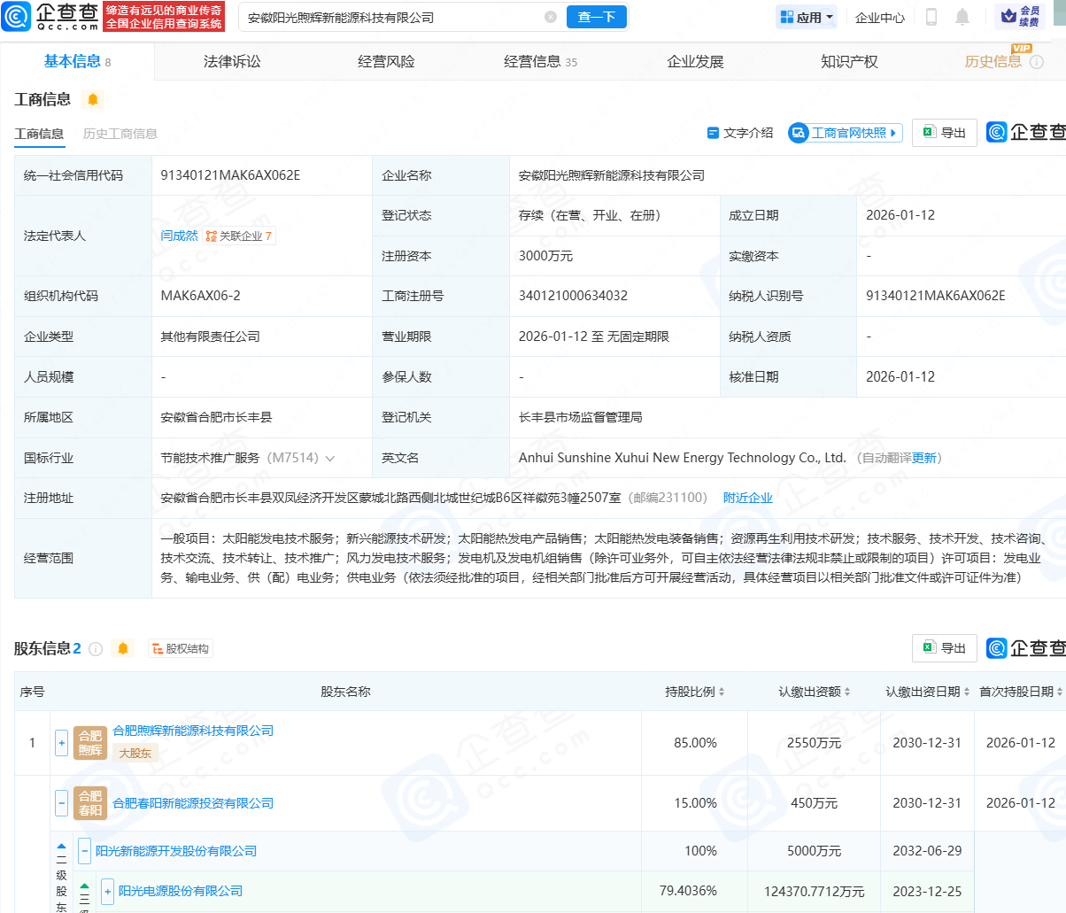 企查查APP显示,近日,安徽阳光煦辉新能源科技有限公司成立,法定代表人为闫成然,注册资本为3000万元,经营范围包含:太阳能发电技术服务;新兴能源技术研发;太阳能热发电产品销售;太阳能热发电装备销售等。企查查股权穿透显示,该公司由合肥煦辉新能源科技有限公司、阳光电源(300274)旗下合肥春阳新能源投资有限公司共同持股。