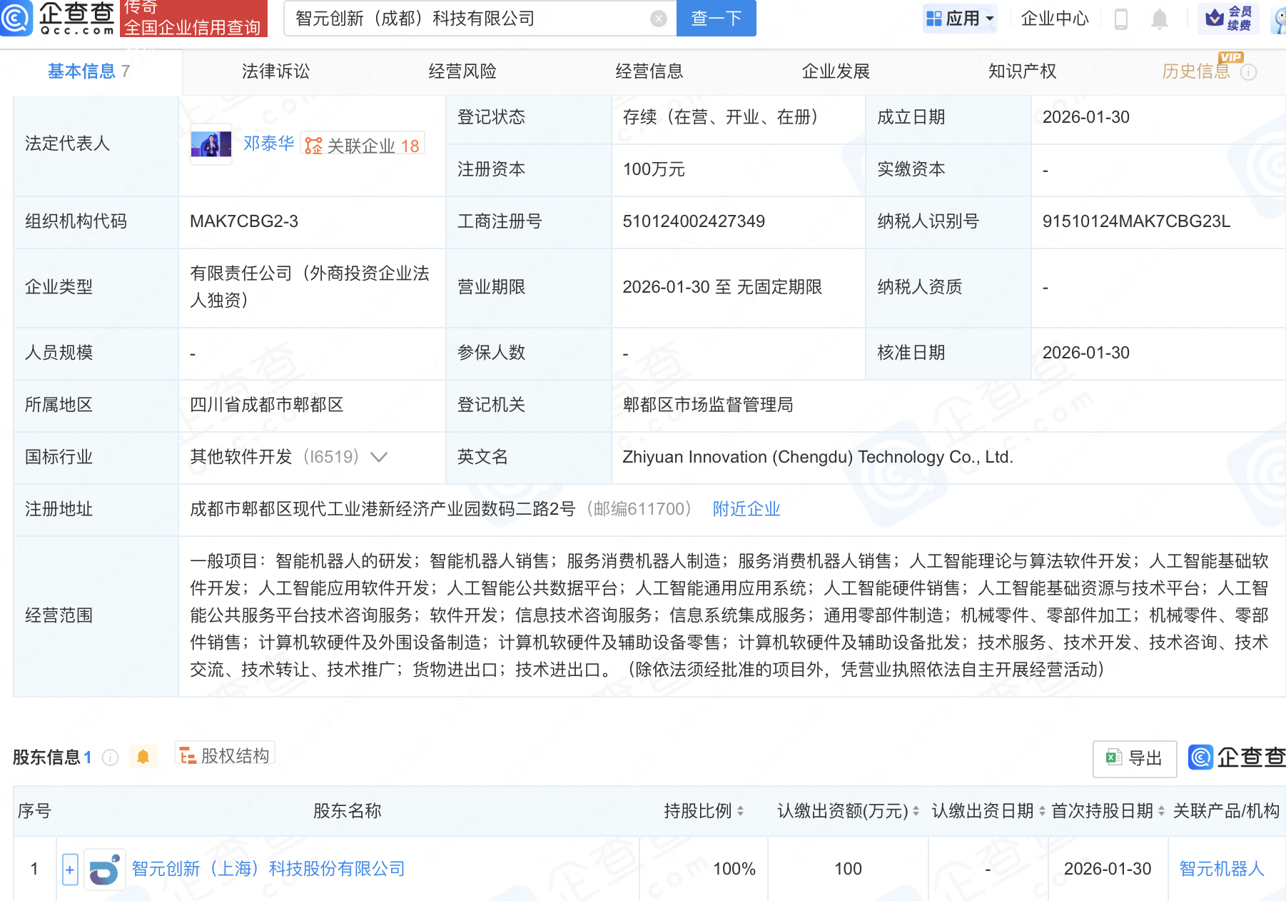企查查APP显示,近日,智元创新(成都)科技有限公司成立,经营范围包含:人工智能公共数据平台;人工智能通用应用系统;人工智能硬件销售;人工智能基础资源与技术平台等。企查查股权穿透显示,该公司由智元机器人关联公司智元创新(上海)科技股份有限公司全资持股。