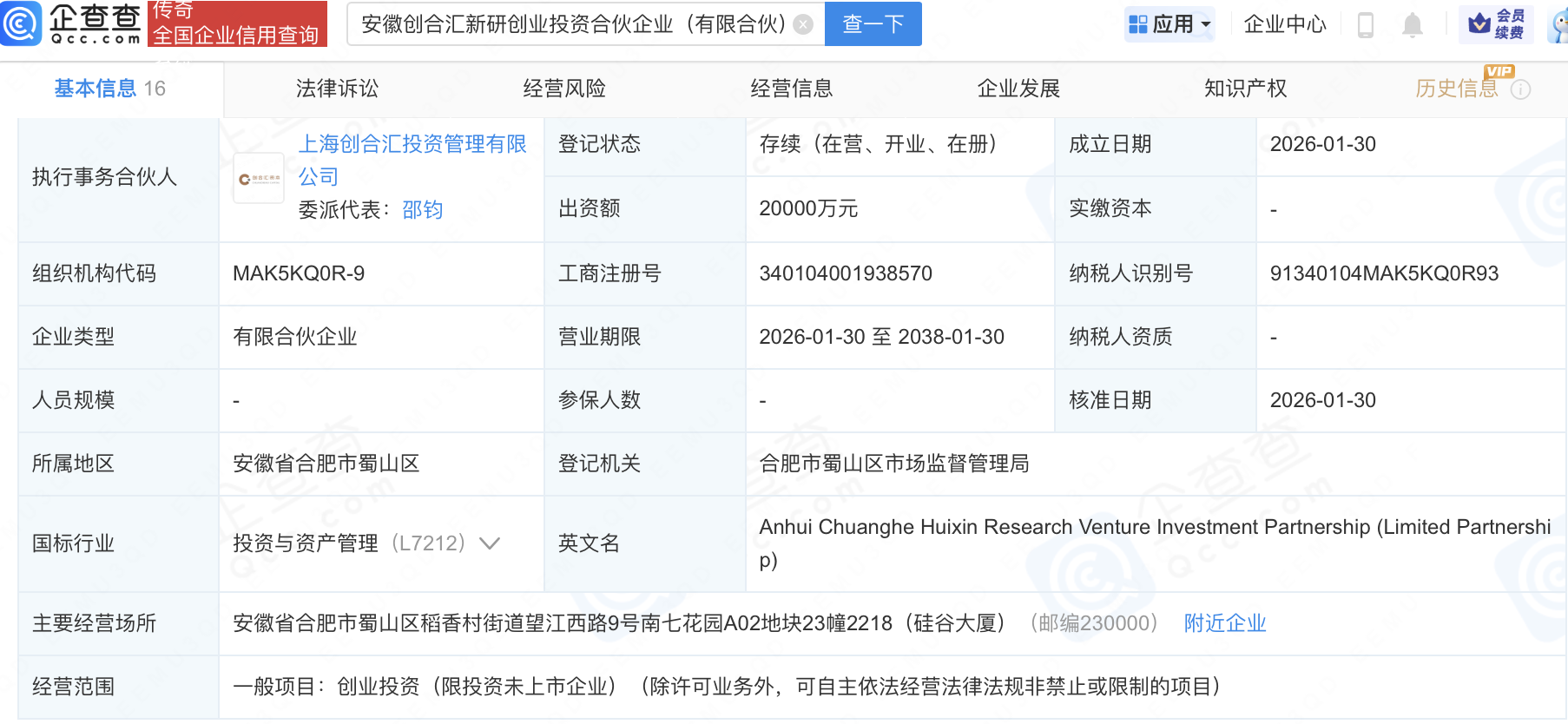 企查查APP显示,近日,安徽创合汇新研创业投资合伙企业(有限合伙)成立,出资额2亿元,经营范围包含:创业投资(限投资未上市企业)。企查查股权穿透显示,该企业由合肥人工智能与大数据研究院有限公司、奥瑞德(600666)等共同出资。