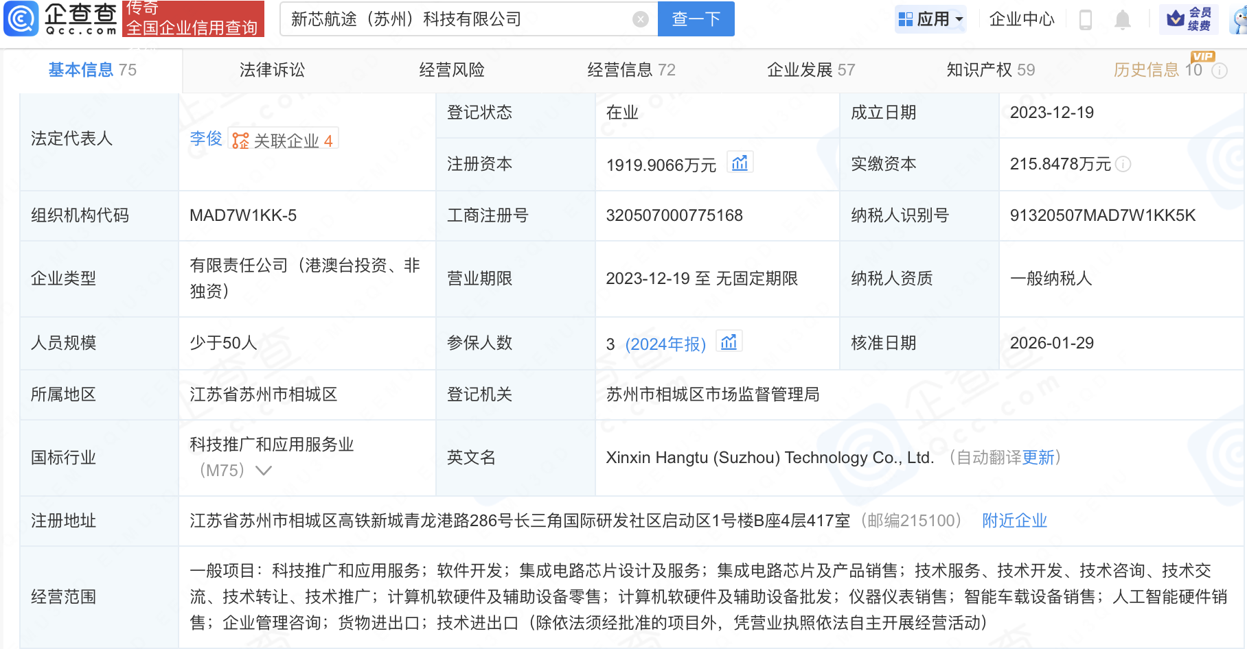 企查查APP显示,近日,新芯航途(苏州)科技有限公司发生工商变更,新增国家人工智能产业投资基金合伙企业(有限合伙)为股东,同时注册资本增至1919.91万元。企查查信息显示,该公司成立于2023年,经营范围包含:集成电路芯片设计及服务;集成电路芯片及产品销售等。公开信息显示,新芯航途是一家自动驾驶芯片设计公司。