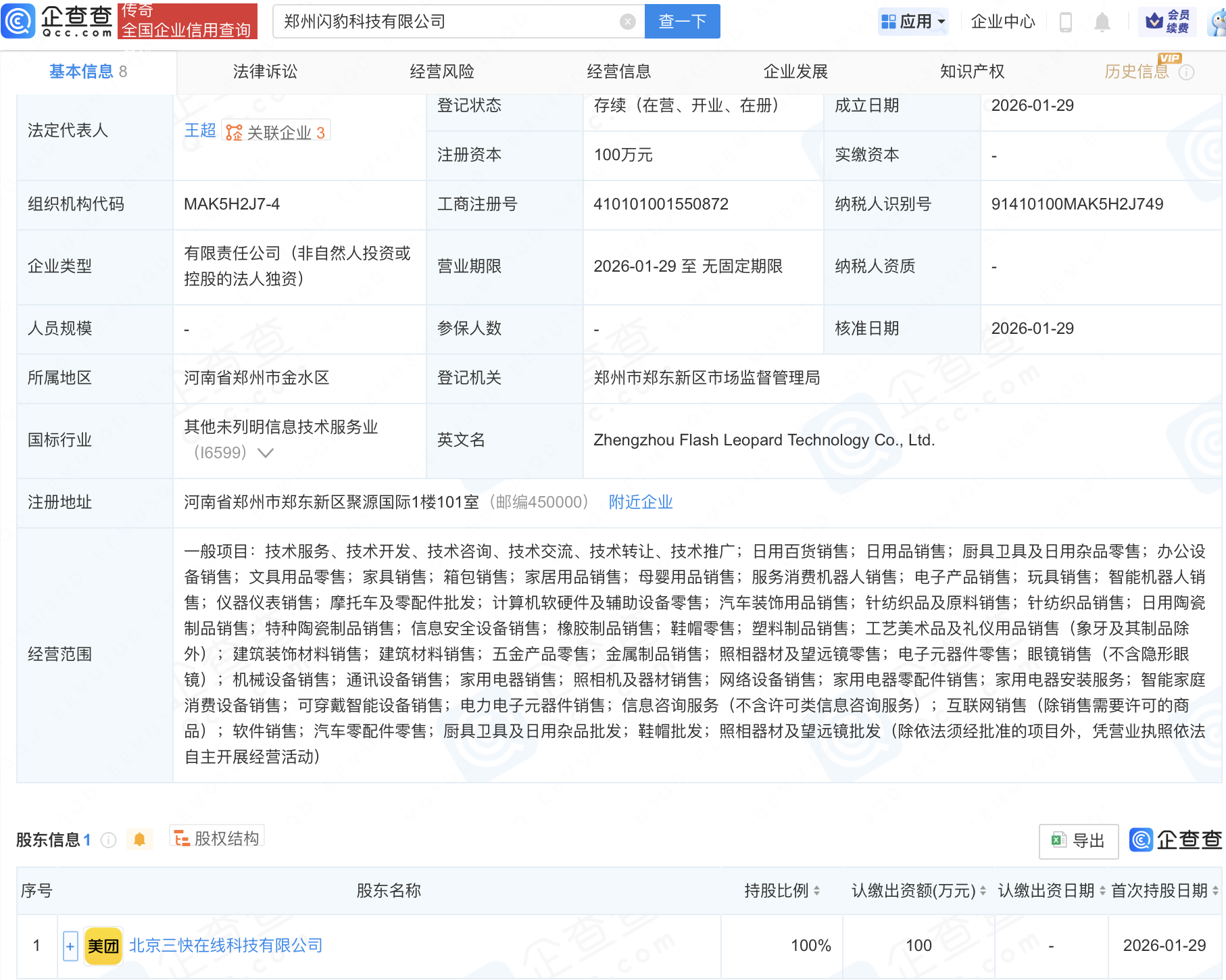 企查查APP显示,近日,郑州闪豹科技有限公司成立,经营范围包含:服务消费机器人销售;电子产品销售;玩具销售;智能机器人销售等。企查查股权穿透显示,该公司由美团关联公司北京三快在线科技有限公司全资持股。