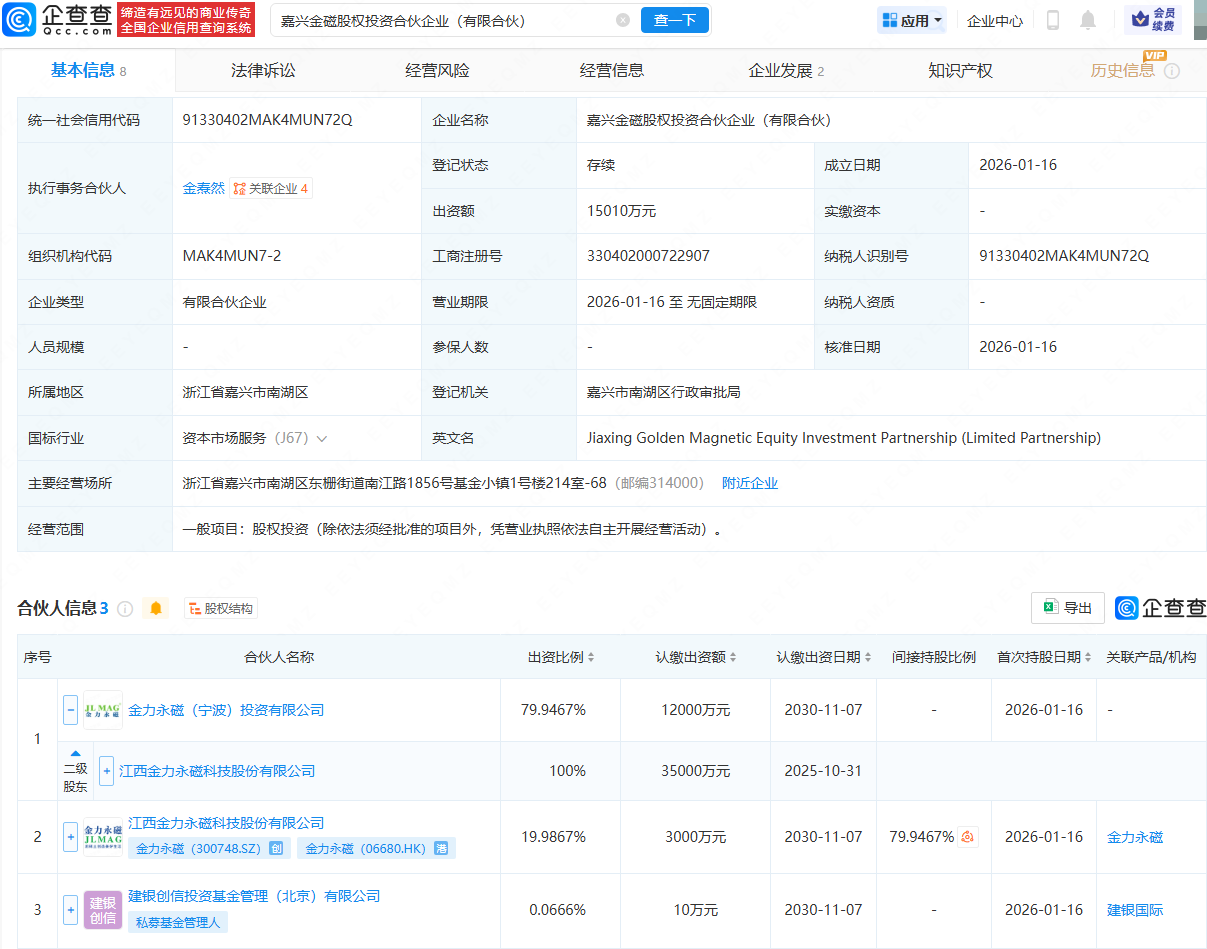 企查查APP显示,近日,嘉兴金磁股权投资合伙企业(有限合伙)成立,出资额约1.5亿元,经营范围包含:股权投资。企查查股权穿透显示,该合伙企业由金力永磁(300748)及其旗下金力永磁(宁波)投资有限公司、建银创信投资基金管理(北京)有限公司共同持股。