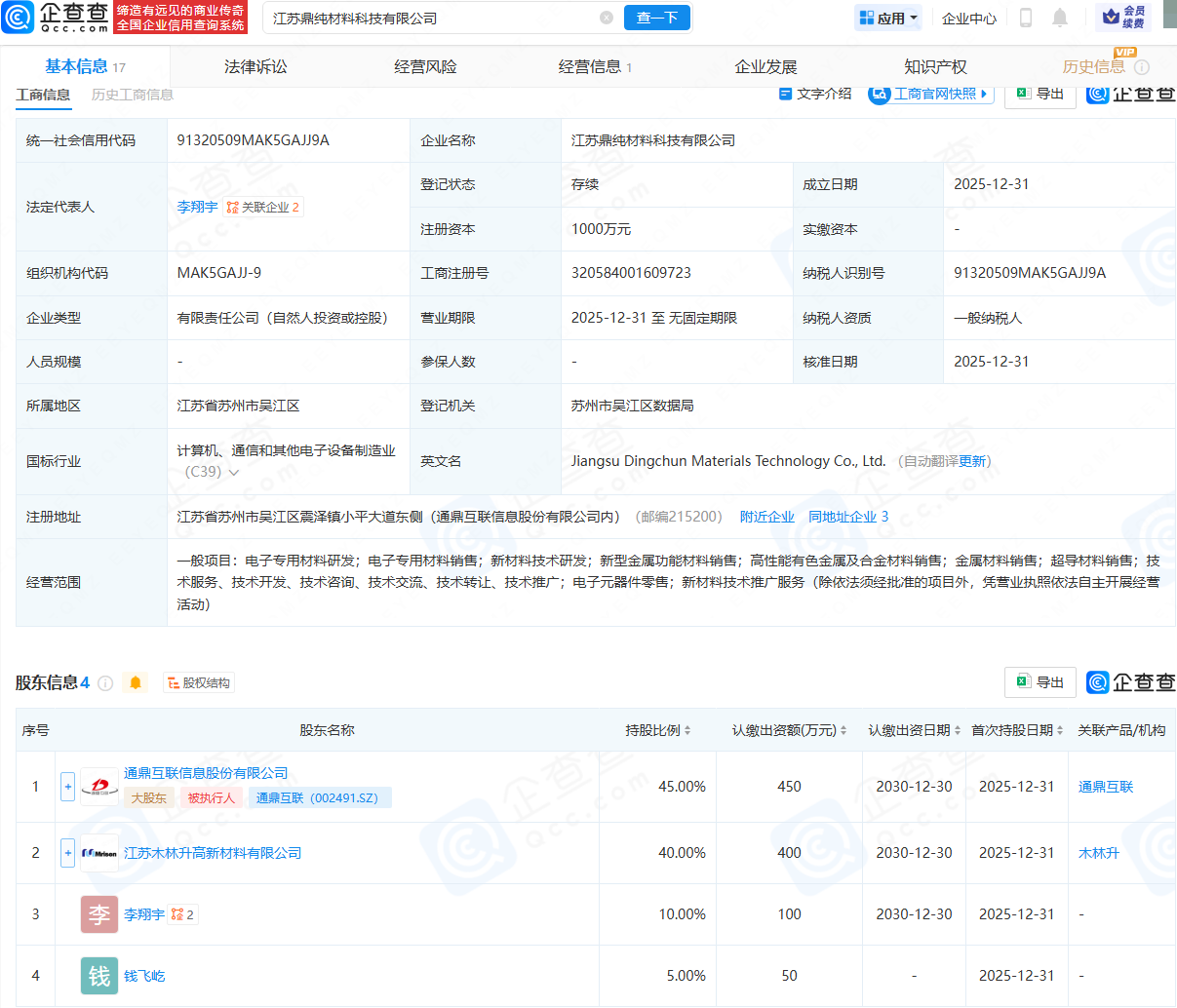 企查查APP显示,江苏鼎纯材料科技有限公司成立,法定代表人为李翔宇,注册资本为1000万元,经营范围包含:电子专用材料研发;新材料技术研发;新型金属功能材料销售;金属材料销售;超导材料销售等。企查查股权穿透显示,该公司由通鼎互联(002491)、江苏木林升高新材料有限公司等共同持股。