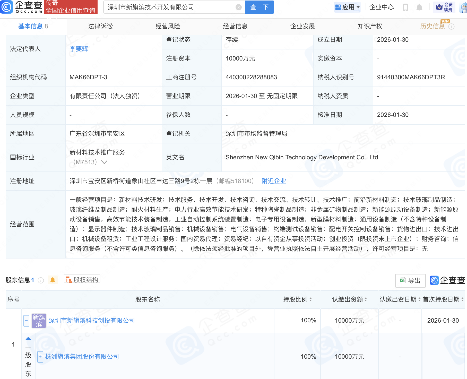 企查查APP显示,近日,深圳市新旗滨技术开发有限公司成立,注册资本1亿元,经营范围包含:前沿新材料制造;新能源原动设备制造;新能源原动设备销售;高效节能技术装备制造等。企查查股权穿透显示,该公司由旗滨集团(601636)间接全资持股。