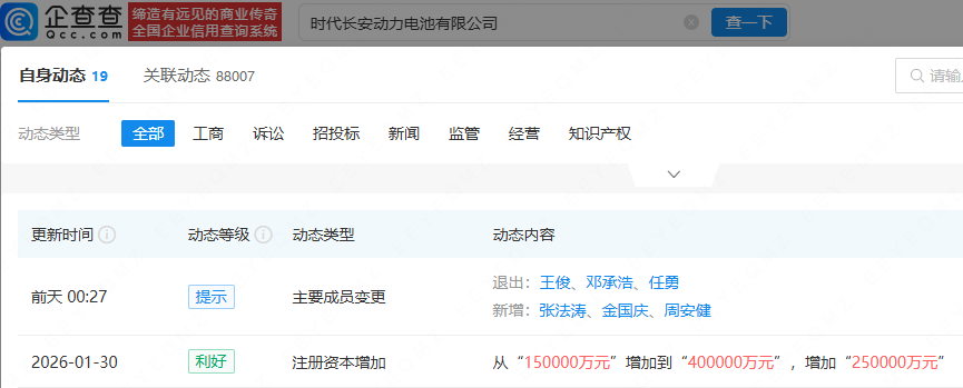 企查查APP显示,近日,时代长安动力电池有限公司发生工商变更,注册资本由15亿元增至40亿元,增幅约167%,同时,公司主要人员亦发生变更。