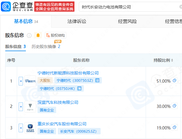 企查查显示,时代长安动力电池有限公司成立于2023年6月,法定代表人为朱云峰,由宁德时代 (300750)、深蓝汽车科技有限公司、长安汽车(000625)共同持股。