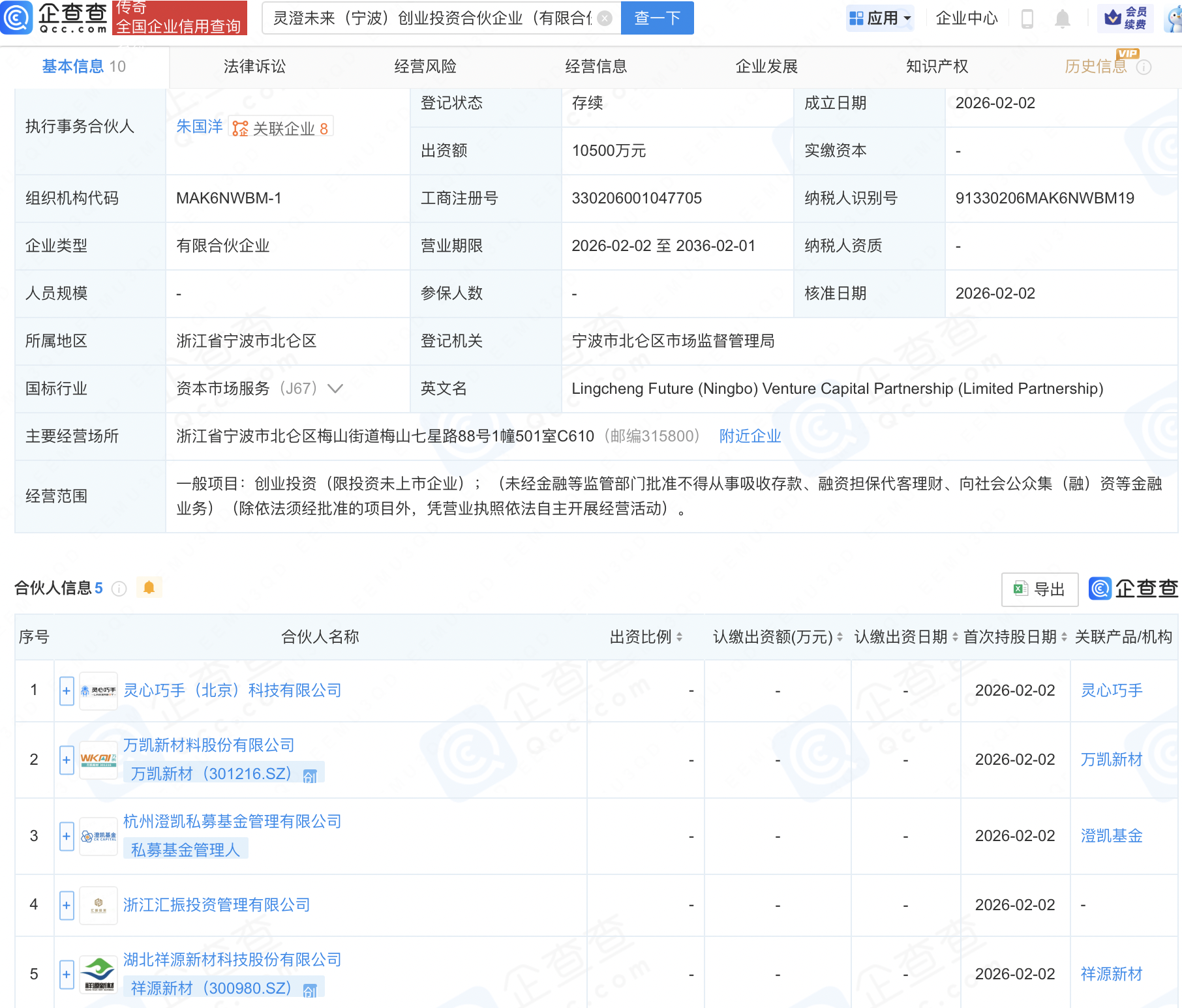 企查查APP显示,近日,灵澄未来(宁波)创业投资合伙企业(有限合伙)成立,出资额1.05亿元,经营范围包含:创业投资(限投资未上市企业)。企查查股权穿透显示,该企业由灵心巧手(北京)科技有限公司、万凯新材(301216)、祥源新材(300980)等共同出资。