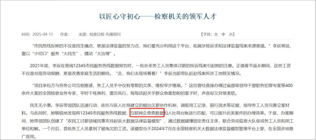 在农民工欠薪案中,北京市通州区检察院查将“企查查”数据与市民服务热线数据、人社局台账等进行匹配,创建了“农民工讨薪领域民事支持起诉大数据法律监督模型”,通过与企查查数据锁定责任主体,提升讨薪案办理效率。目前,该模型已在全国多地推广应用。