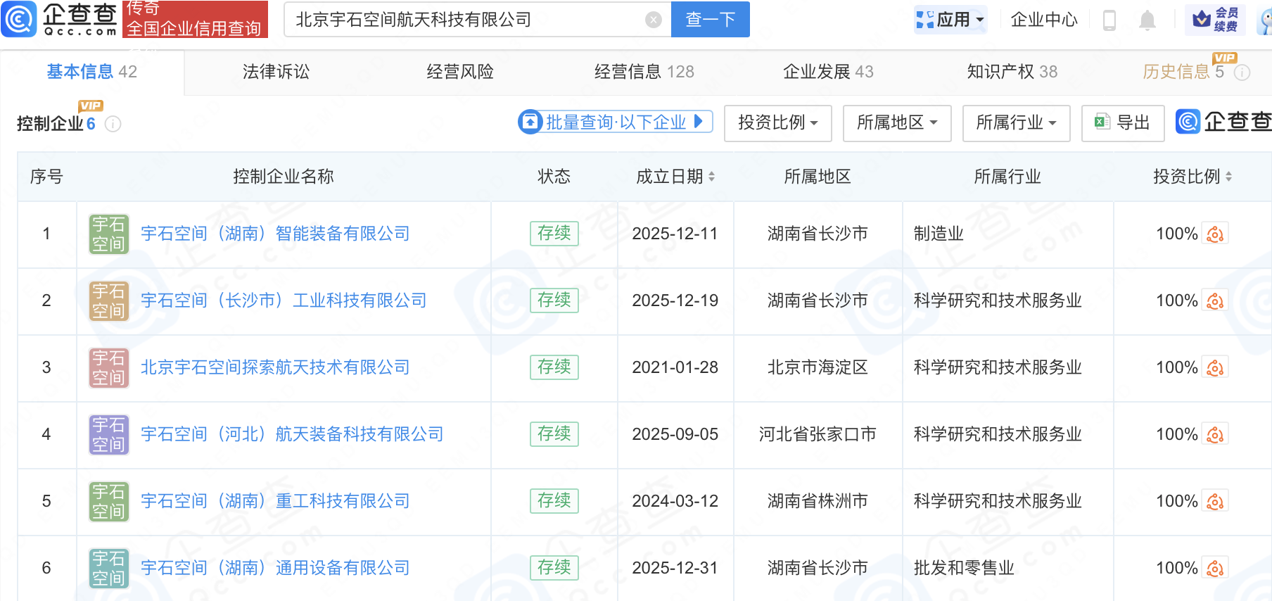 企查查APP显示,北京宇石空间航天科技有限公司全资子公司北京宇石空间探索航天技术有限公司发生工商变更,登记机关由北京市海淀区市场监督管理局变更为株洲市石峰区市场监督管理局。