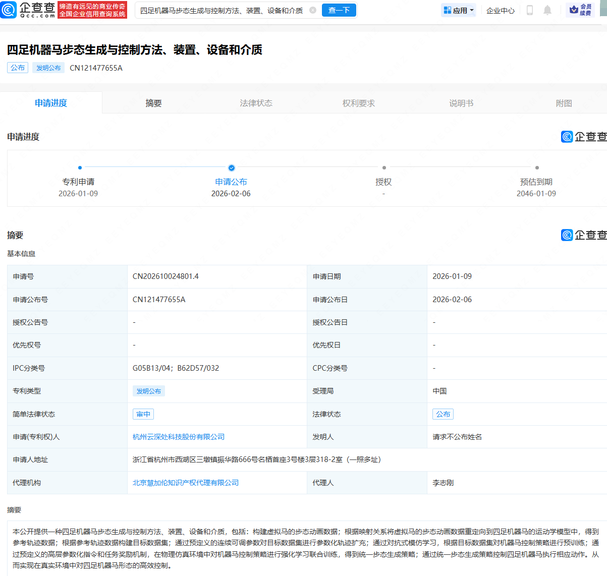 企查查APP显示,近日,杭州云深处科技股份有限公司申请公布“四足机器马步态生成与控制方法、装置、设备和介质”专利。