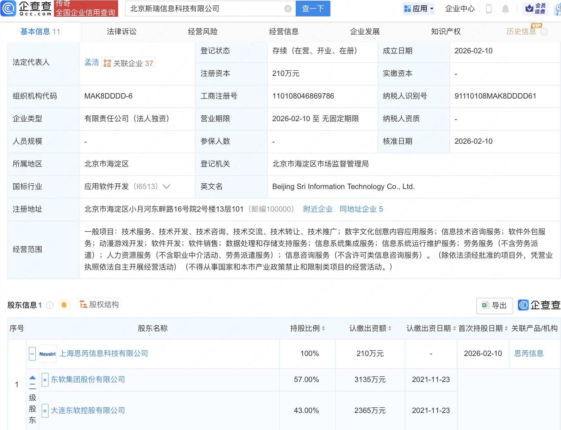 企查查APP显示,近日,北京斯瑞信息科技有限公司成立,法定代表人为孟浩,注册资本210万人民币,经营范围含数字文化创意内容应用服务、信息技术咨询服务、软件外包服务、动漫游戏开发等。企查查股权穿透显示,该公司由东软集团(600718)旗下上海思芮信息科技有限公司全资持股。