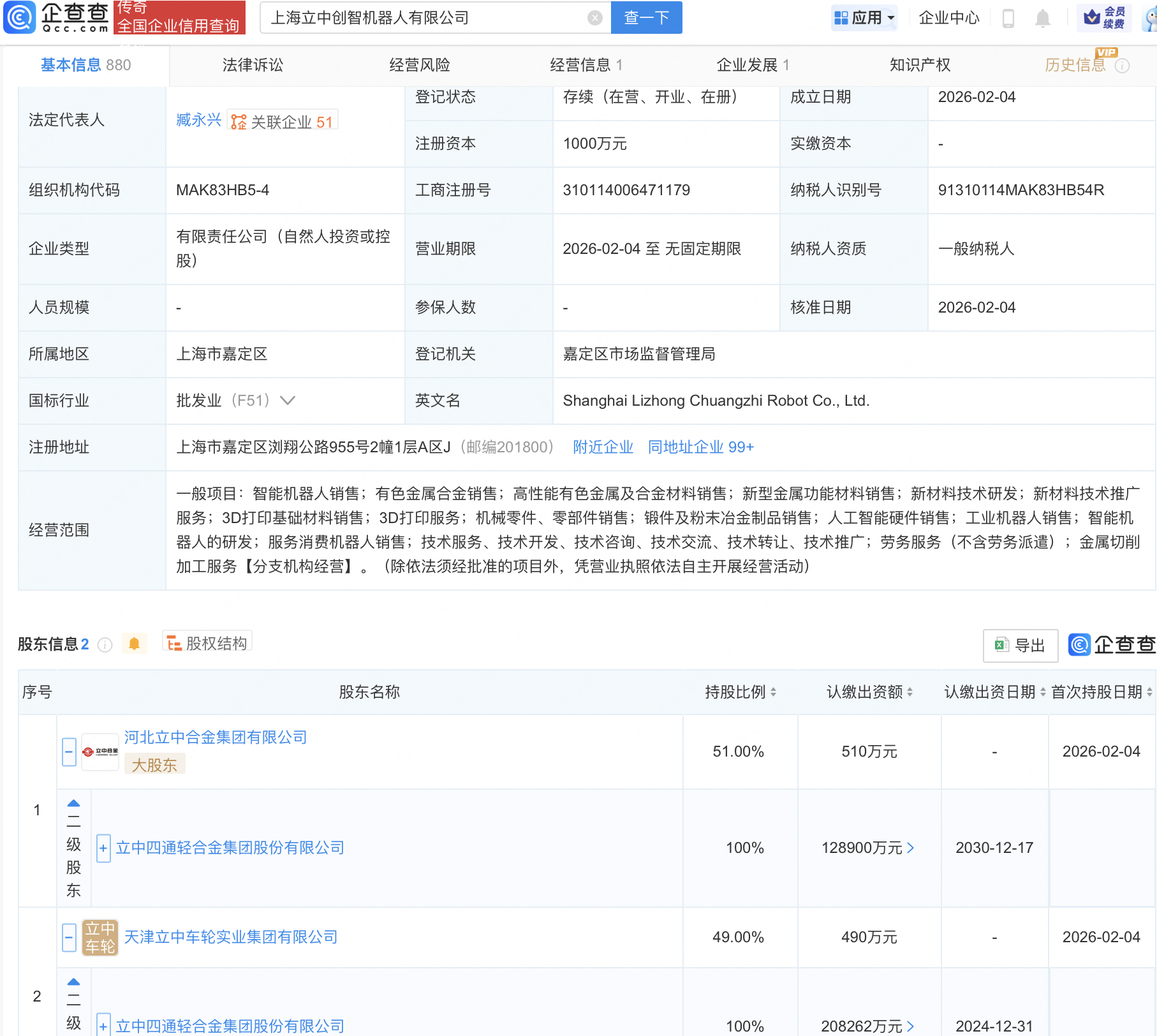 企查查APP显示,近日,上海立中创智机器人有限公司成立,注册资本1000万元,经营范围包含:人工智能硬件销售;工业机器人销售;智能机器人的研发;服务消费机器人销售等。企查查股权穿透显示,该公司由立中集团(300428)间接全资持股。