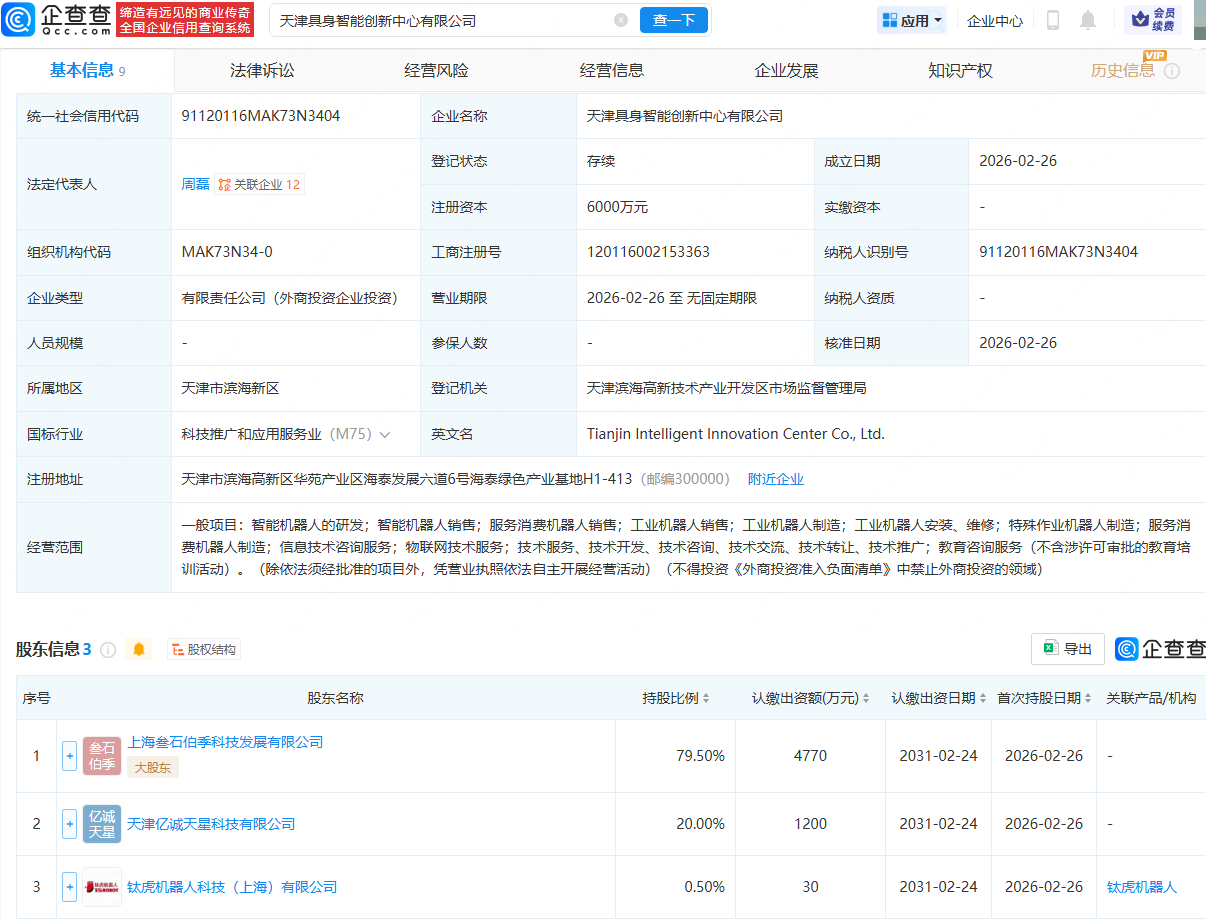 企查查APP显示,近日,天津具身智能创新中心有限公司成立,法定代表人为周磊,注册资本为6000万元,经营范围包含:智能机器人的研发;智能机器人销售;服务消费机器人销售;工业机器人销售;工业机器人制造等。企查查股权穿透显示,该公司由钛虎机器人科技(上海)有限公司、上海叁石伯季科技发展有限公司、天津亿诚天星科技有限公司共同持股。