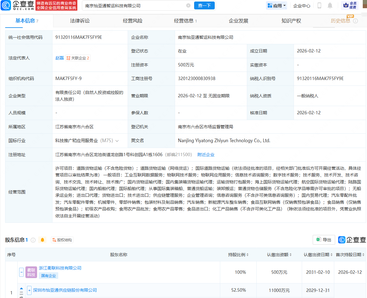 企查查APP显示,近日,南京怡亚通智运科技有限公司成立,法定代表人为赵磊,经营范围包含:工业互联网数据服务;物联网技术服务;国内货物运输代理;海上国际货物运输代理;国内船舶代理等。企查查股权穿透显示,该公司由怡亚通(002183)旗下浙江衢联科技有限公司全资持股。