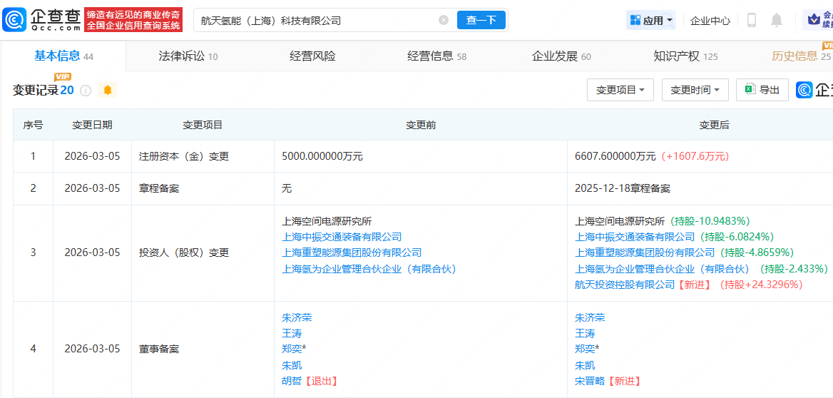 企查查APP显示,近日,航天氢能(上海)科技有限公司发生工商变更,注册资本增加至6607.6万元,新增航天投资控股有限公司为股东,持股比例约为24.33%,同时,公司主要人员亦发生变更。