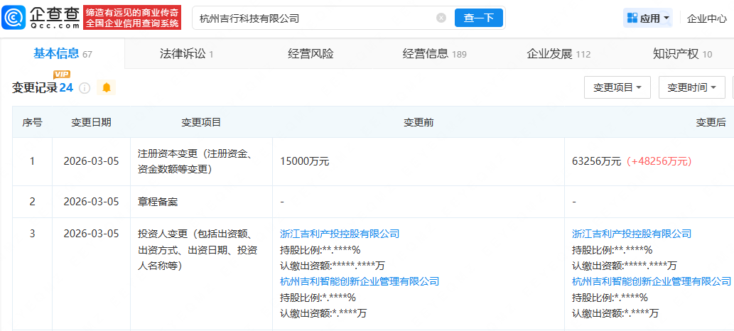 企查查APP显示,近日,杭州吉行科技有限公司发生工商变更,注册资本由1.5亿人民币增至约6.3亿人民币,增幅约322%。
